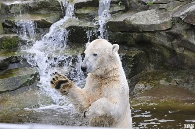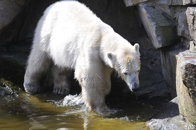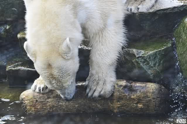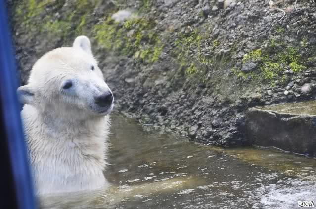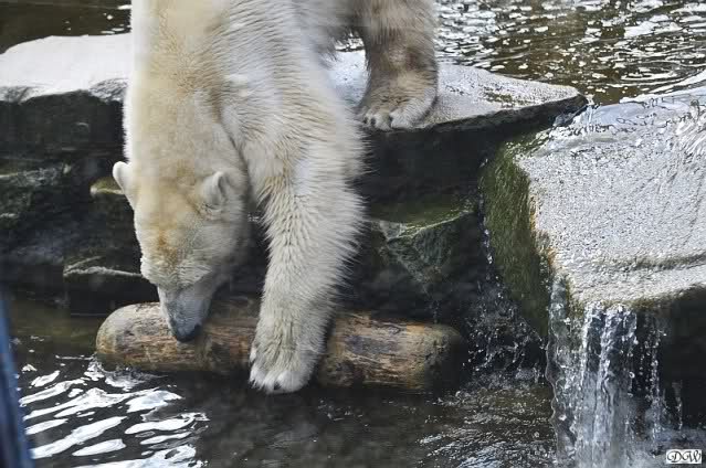 Weniger schön fand ich, dass wieder Kinder oben auf dem Felsen neben Knuts Gehege standen. Die Erwachsenen sagten nichts dazu. Im Gegenteil, sie reichten den Kindern noch Kameras hoch, damit sie tolle Bilder von den im Wasser spielenden Eisbären machen sollten.