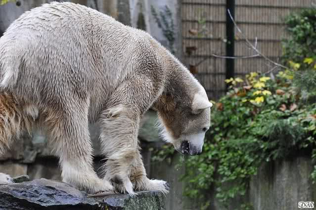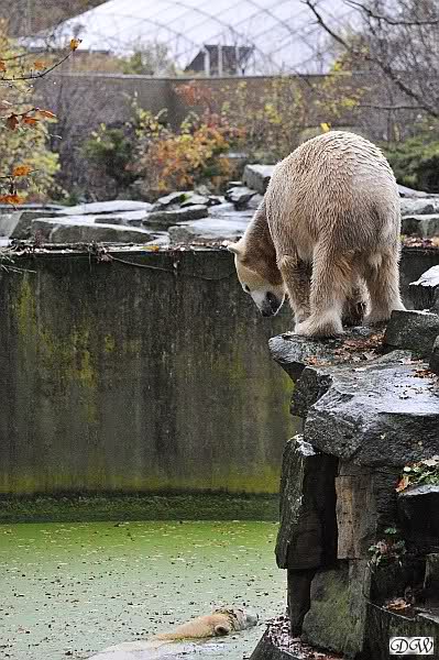 Noch ganz schnell einen Abstecher in den Zoo, dachten wir uns. Strömender Regen, aber nicht eiskalt. War es leer an Knut’s Anlage? Natürlich nicht. Knut wartete schon auf die Fütterung. Endlich war es soweit. Die drei Braunbären saßen erwartungsvoll da und hofften sie würden etwas bekommen. Wieder Fehlanzeige. Ein paar Äpfel oder Möhrchen? Auch nicht.