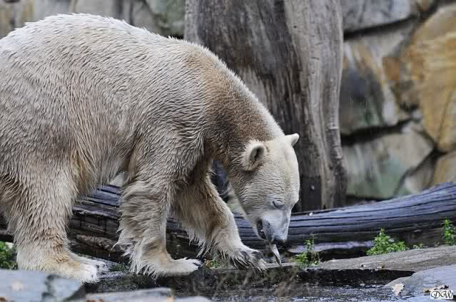 Knut setzte sich in seinen Pool und wählte einmal mehr sorgfältig die Speisenfolge aus. Der Pfleger warf ihm den Salat diesmal nicht zu, sondern in den Pool. Ein Fisch landete oben im Wasser, der Knut später sehr erfreute. Bei Fleisch und Fisch zögerte Knut heute nicht lange. Einen Kürbis gab es nicht, dafür aber einen großen Lachs. Als Gianna herauskam, schaute sie sich kurz um und dann ging es flugs nach unten. Knut flitzte wieder weg, ließ sie aber nie aus den Augen. Er verfolgte jede Bewegung von ihr und während sie unten seinen Salat auffraß, fand er oben seinen Fisch und verspeiste ihn. Gianna suchte sehr vorsichtig alles ab und leckte letztendlich den „Tisch“ mit den Lachsresten ab. Während sie im Graben schwamm, verfolgte Knut sie von oben. Dreimal kam es zu Kontakt zwischen den Beiden. Da der Pfleger von einer Stammbesucherin in ein Gespräch verwickelt wurde, sah er eine der Begegnungen auch. Herr Henkel reinigte währenddessen weiter Jürgen’s Anlage. Später bekam er Unterstützung. Knut und auch Gianna sahen beiden Pflegern aufmerksam zu. Herr Henkel, der vorher schon einen Fisch zu Knut geworfen hatte, sprach ihn öfter, trotz der schweren Arbeit, an.