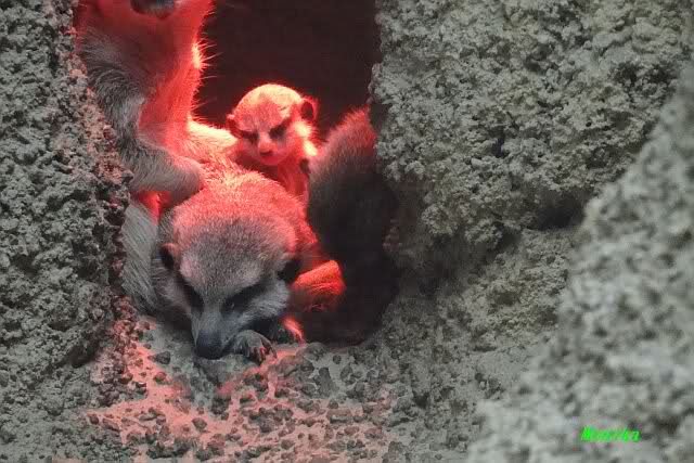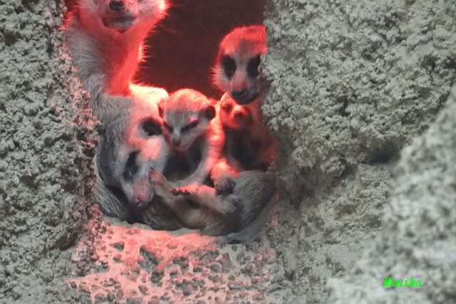 Die Erdmännchen wärmen sich unter der Rotlichtlampe