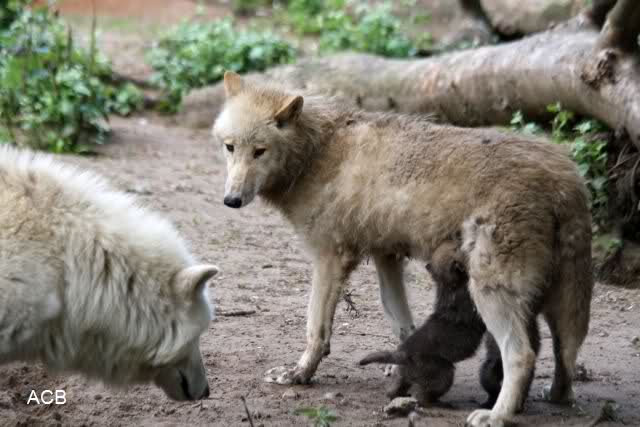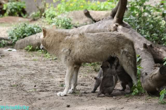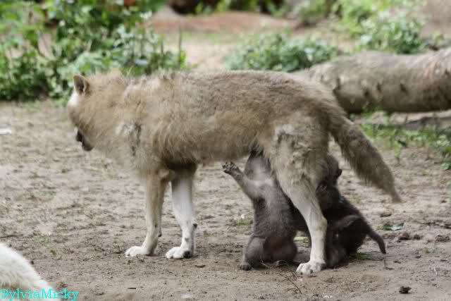 Ein typisches Bild bei den Wölfen. Die Mutter liegt und zwei Junge säugen. Der dritte steht abseits