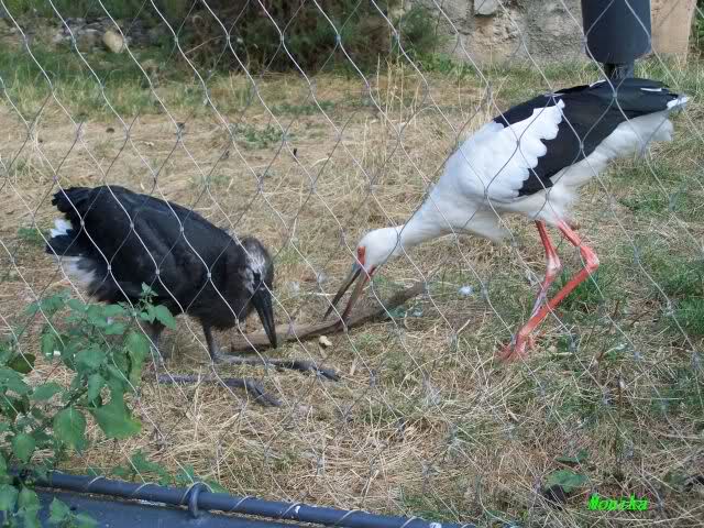 Der kleine Storch ist inzweischen schon fast so groß wie seine Mutter. Am Kopf und auch am Schwanz kommen die ersten weißen Federn durch.