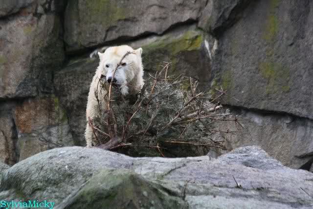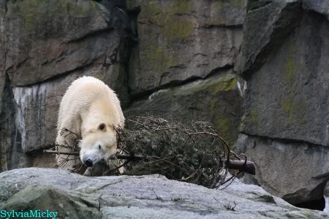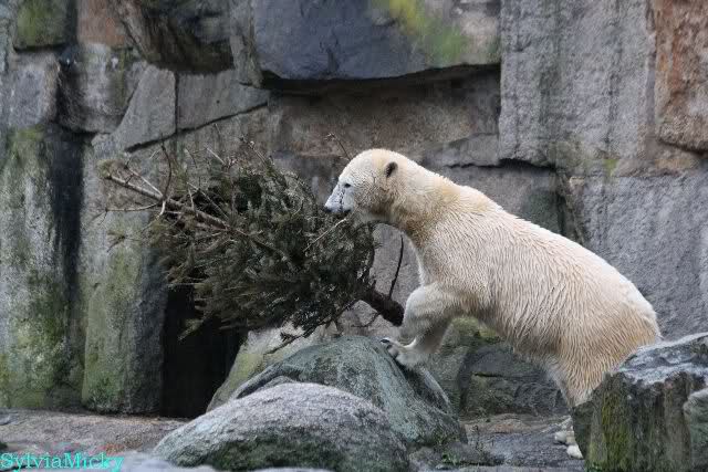 Nach der Fütterung wurde weiter im Wasser gespielt. Knut hatte dann keine Lust mehr. Also begann das Einkriegezeck vom Vormittag von vorn. Tosca immer wieder hinter ihm her. Dann wurde es ihr zu langweilig. Sie schnappte sich den Tannenbaum, wollte erst in Knuts Höhle und ging dann mit dem Baum auf einen Felsen. Ich bewundere Toscas Ausdauer. Sie geben sich wirklich gegenseitig viel.