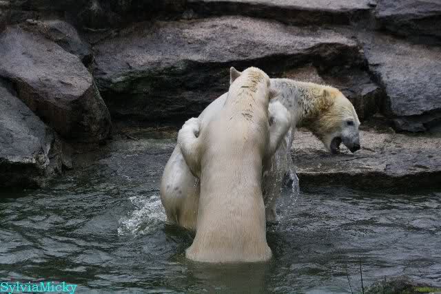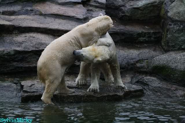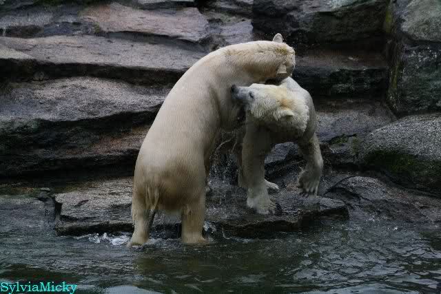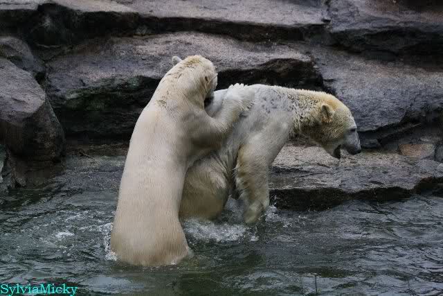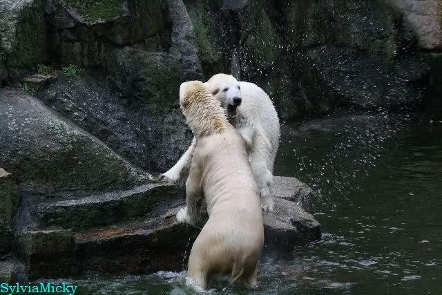 Das Spielen von Knut und Tosca sieht brutal aus. Das sind eben die Bärenkräfte. Auf den Bildern mit Tosca auf Knuts Rücken sieht es so aus, ob Knut brüllen würde: "Geh von meinem Rücken!"