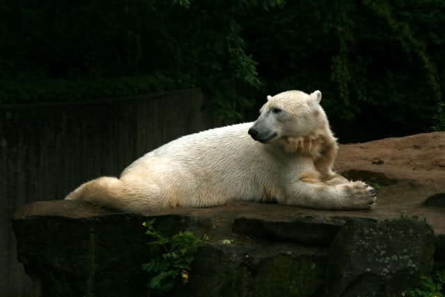 Er legt sich an die äußere Kante und schaut immer wieder ängstlich zu den Menschen, armer Bär ...