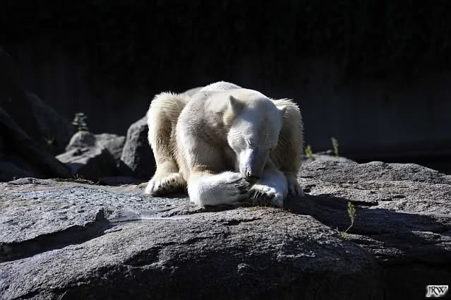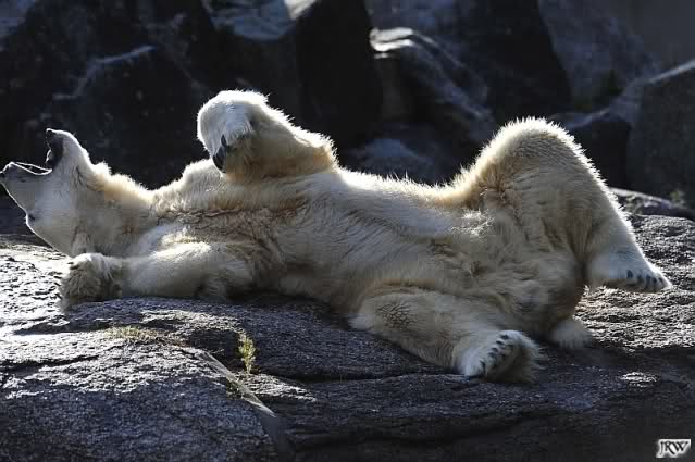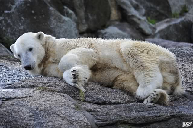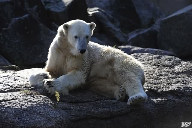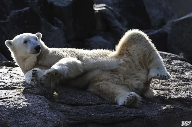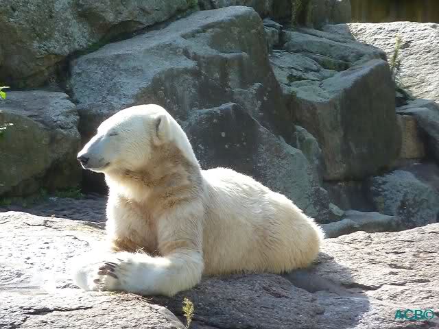 Knut liegt entspannt vorne auf dem Felsen, Tosca hat einen ganz zarten Annäherungsversuch gestartet, hat sich Knut langsam angenähert und ihm ein Küsschen gegeben. Knut hat sich dabei ein wenig erhoben, sich aber gleich wieder hingelegt. Ansonsten läuft Tosca hin und her und Nancy schreit gotterbärmlich nebenan....