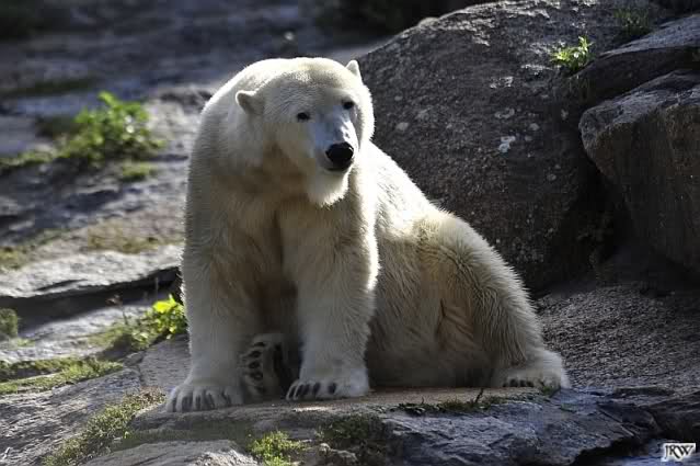 Als ich gegen 12 Uhr ging, lag Knut am rechten Felsenrand nahe am Wasser und Tosca tronte weit weg auf einem Stein.