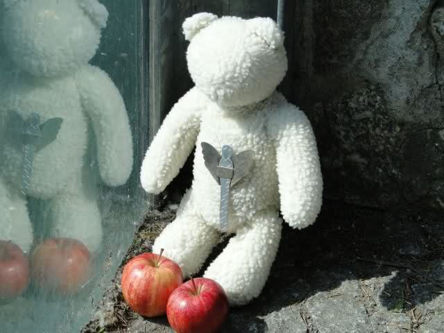 Heute Morgen setzte eine Schulklasse diesen Bären ohne Gesicht und mit einem Engel um den Hals vor die Scheibe am Eisbärgehege.