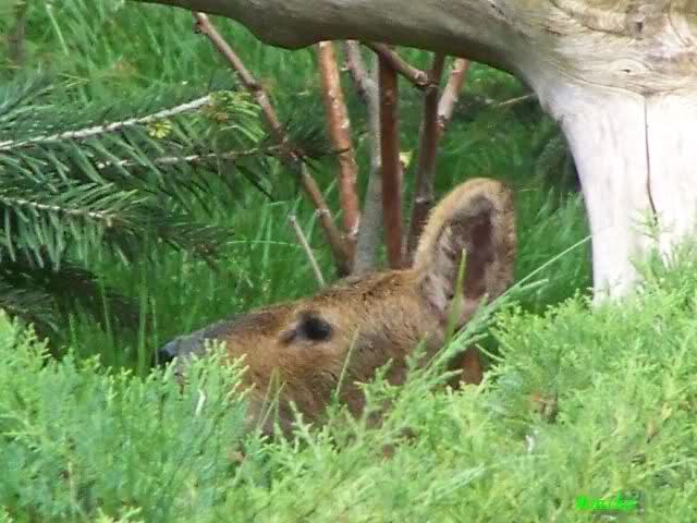 Das chinesische Wasserreh wurde in letzter Zeit wieder zum Phantom. Heute blinzelte es durch die Zweige hervor. Zumindest ein Teil vom Kopf. Es ist jedenfalls noch da.