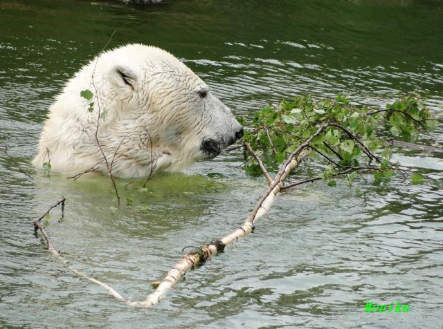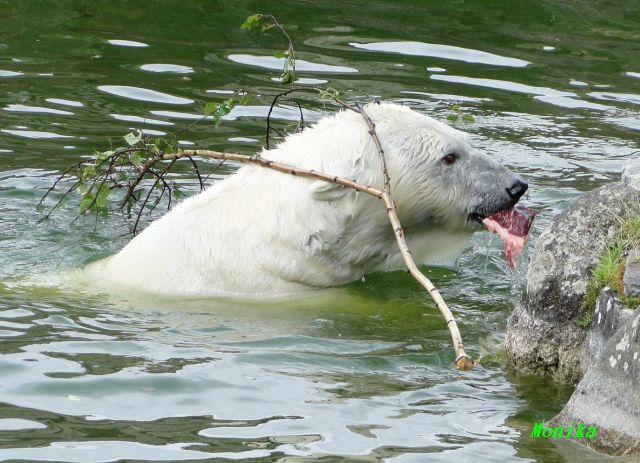 Heute Morgen schliefen die drei Ladys noch. Katjuscha und Nancy erwachten zuerst und spielten kurz miteinander. Katjuscha ging dann ins Wasser und beschäftigte sich mit den Zweigen.