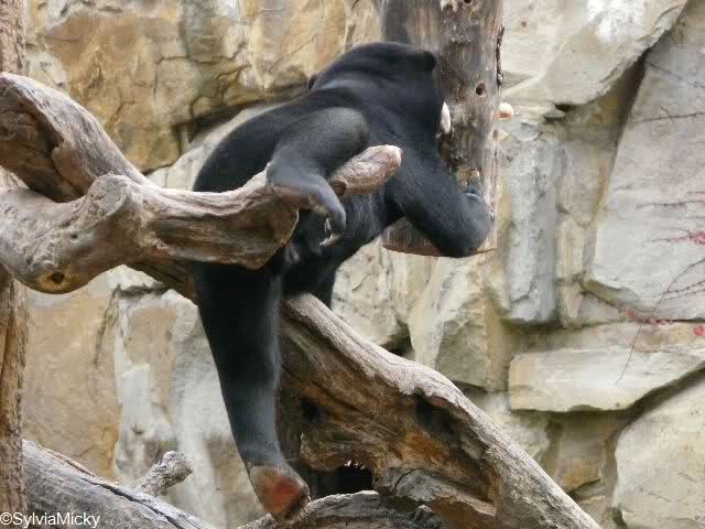 Herr Röbke bestückte die Anlage der Malaienbären reichlich mit viel Obst und Brötchen. Die Brötchen wurden in die Felsennischen drapiert und die Bäume wurden mit Pflaumenmus bestrichen und Fleisch gab es auch.