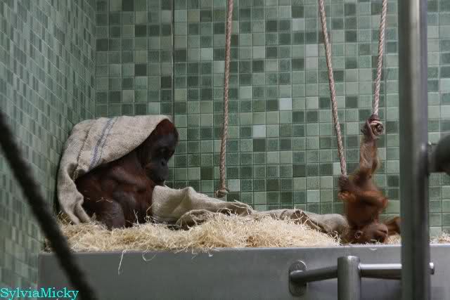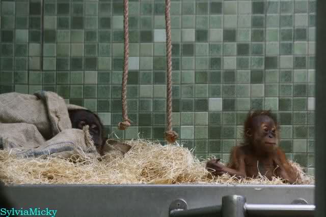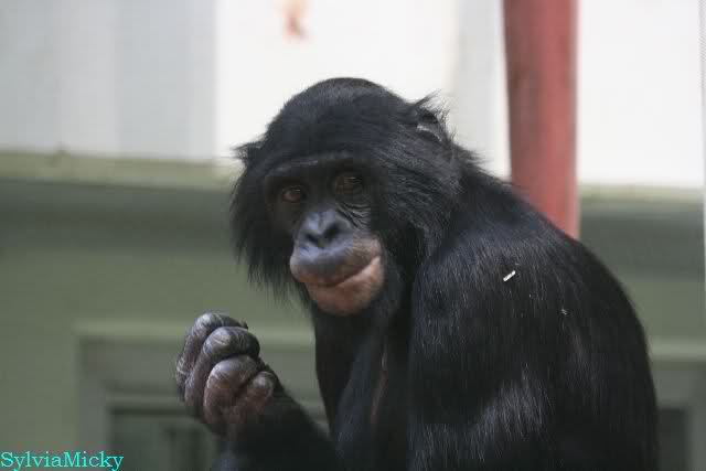 Die Zusammenführung der Bonobos hat gut geklappt. Der Neue saß zwar im rechten Käfig aber die Tür zum anderen Käfig war auf