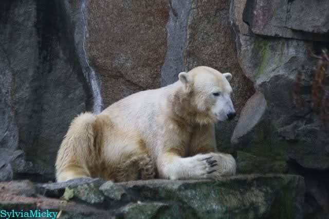 Nach der Fütterung ging er auf die Anlage, beobachtet von Kati. Sie kam dann auch angerannt. Es gab Gefauche und Gebrumme. Die beiden anderen kamen natürlich auch an. Knut blieb aber standhaft und die drei trollten sich. Er blieb eine Weile an der Mauer liegen, beschloß aber dann doch auf die vordere rechte Ecke zu gehen. Da lag er noch, als ich um Mittag den Zoo verließ.