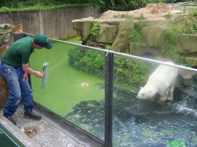 Eine Anmerkung habe ich allerdings: Da die Glasscheiben bei Knut geputzt worden sind, warum hat man da nicht gleich auch das grüne Wasser abgelassen und erneuert? Schliesslich kam ja nicht irgendein Team in den Zoo, sondern das ZDF mit Hannes Jaennicke. Da hätte man einen sauberen Knutgraben erwarten können. Naja, alles ist eben nicht machbar