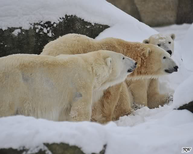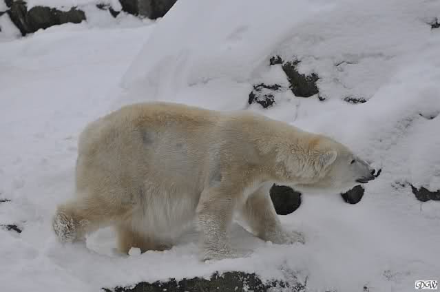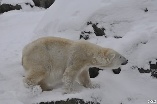 Ich kam leider zu spät, sah also nicht, was die Besucher am frühen Morgen zwischen Knut und Tosca erlebt haben, schade. Schöne Filme hast Du mitgebracht, Monika! Es schneite ununterbrochen, ein richtiges Eisbärwetter! Ich filmte danach Tosca, die sich sichtlich wohl fühlte.