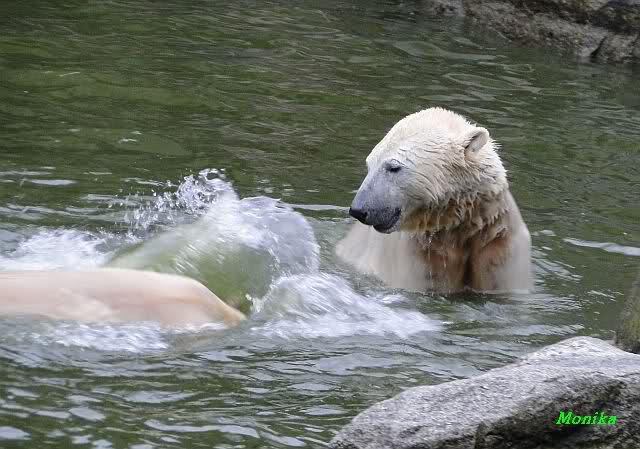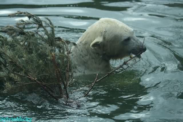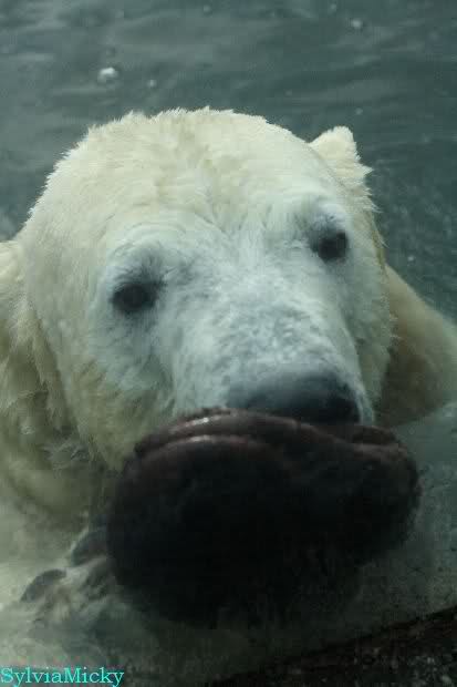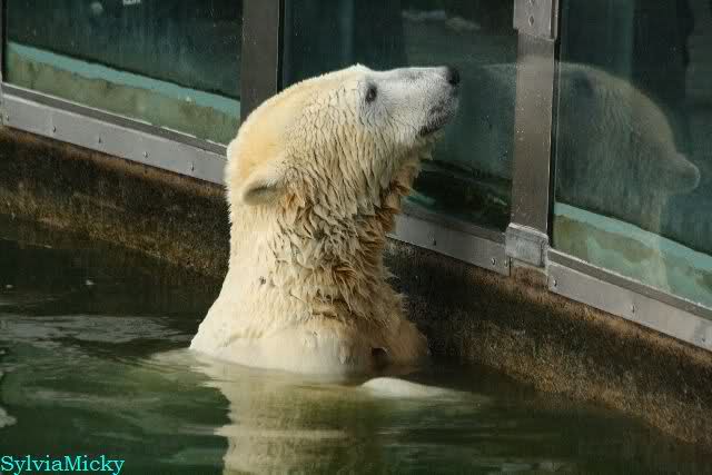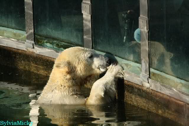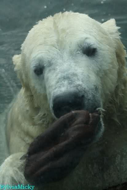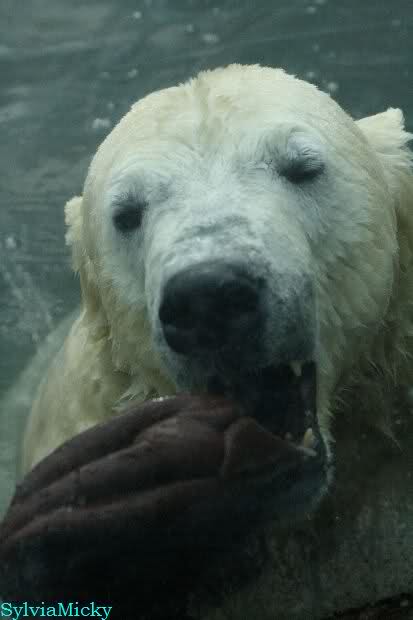 Ludmilla, Knut kaute gestern im Wasser auf irgendetwas aus Weichplastik und fraß auch Teile davon. Danach hatte er viel Schaum am Maul. Er schüttelte den Kopf und der ganze Sabber flog an die Scheibe.