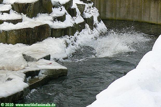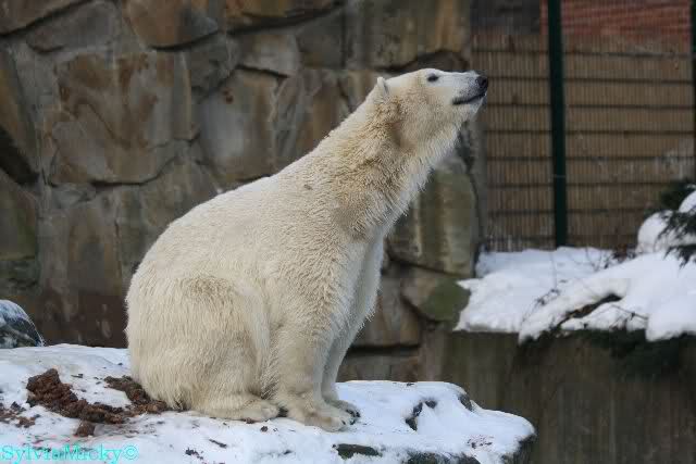 Sie tobten auch gemeinsam im Wasser. Gerauft und geschmust wurde auch wieder. Die Braunbärin Siddy sühlte sich ausgiebig im Schnee, was Giana sehr interessant fand. Sie wäre am liebsten rüber gesprungen. Immer wieder stellte sie sich auf, um Siddy zuzusehen.Knut blutete heute früh ziemlich stark an der Kralle an der linken Pfote, leckte auch oft daran. Bei der Fütterung der drei Eisbärdamen sprachen wir die beiden jungen Pfleger darauf an, die es weiter geben wollten.