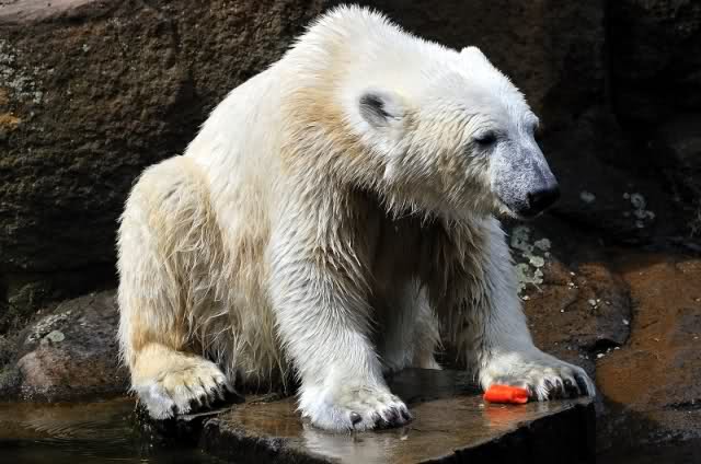 Noch eine kleine Bemerkung für alle, die Knut schon Spielzeug geschenkt haben. Er bekommt es wirklich. Ich habe heute Herrn Dörflein gefragt, ob Knut die Spielsachen bekommen hätte, die ich mal mitgebracht habe. Herr Dörflein wusste sofort, wovon ich spreche, beschrieb die Sachen seinerseits und meinte, Knut hätte alles schon längst bekommen. Den Ball mit dem Tau daran hätte sich Knut sofort geschnappt und in den Wassergraben mitgenommen. Dort hätte er es versteckt. Den Jutesack hätte er zerfetzt, das Innenleben geistert durch den Wassergraben. Jetzt weiß ich auch, warum Knut zwei rosa Quietscheigel hat. Darüber habe ich mich natürlich sehr gefreut.
