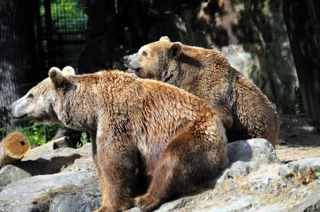 Dann bekamen auch noch die Braunbären ihren Anteil am Essen und auch sie bekamen Äste zum Spielen. So ungemütlich das Wetter war, es hatte auch seine Vorteile. Es gab kein Gedränge an den Scheiben und man konnte alles gut sehen.