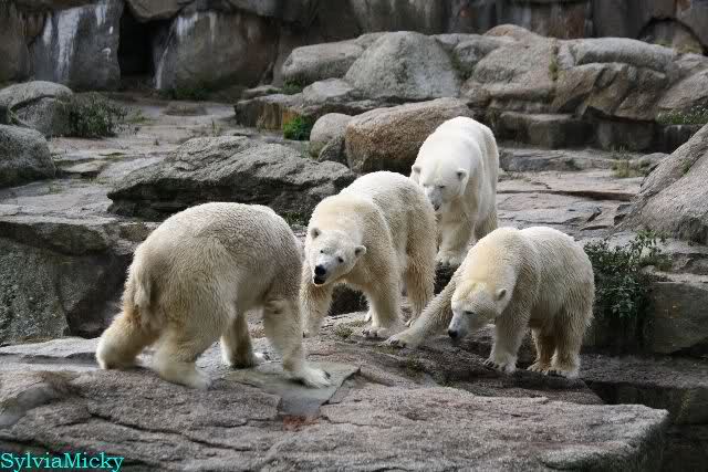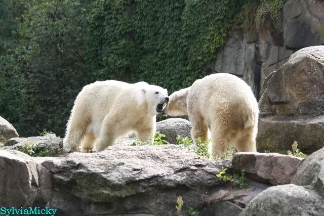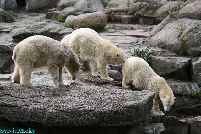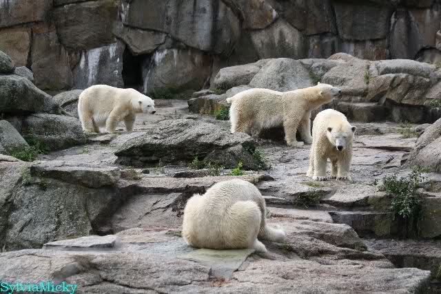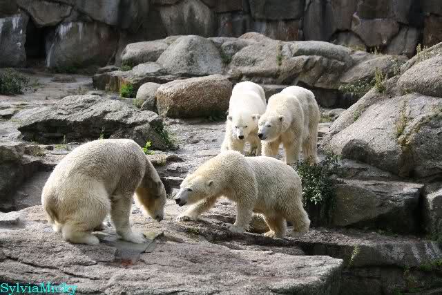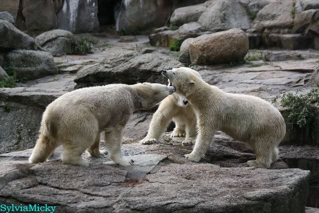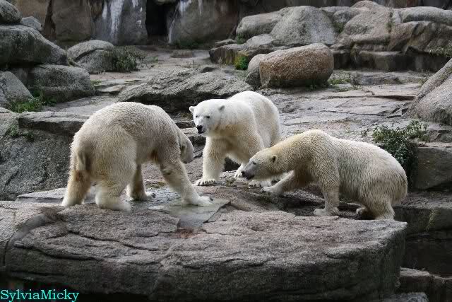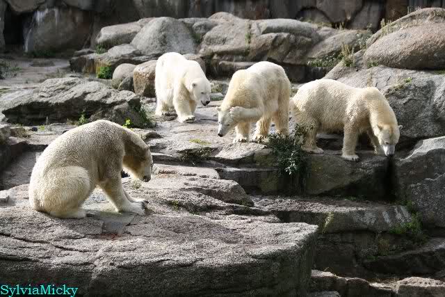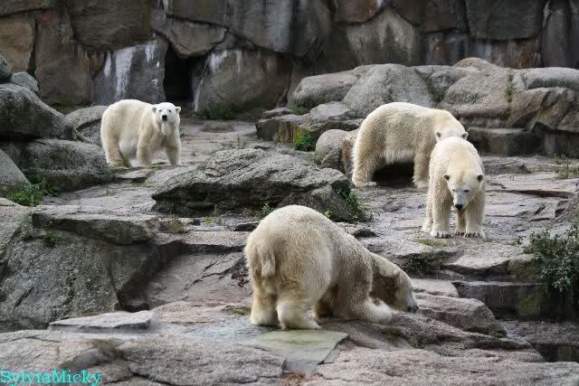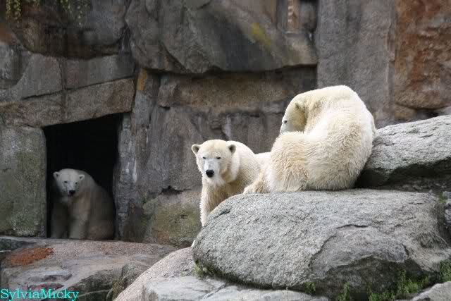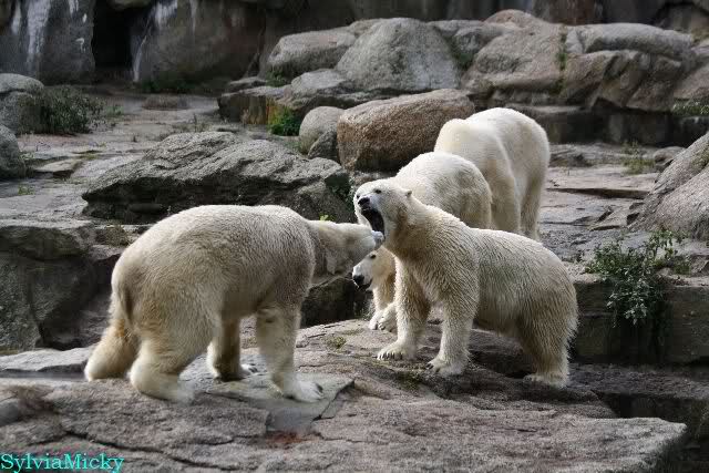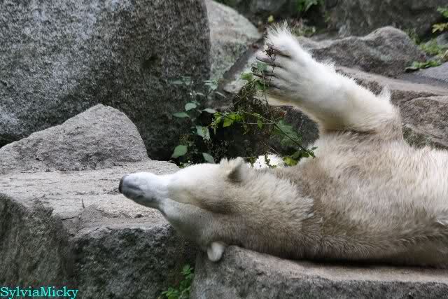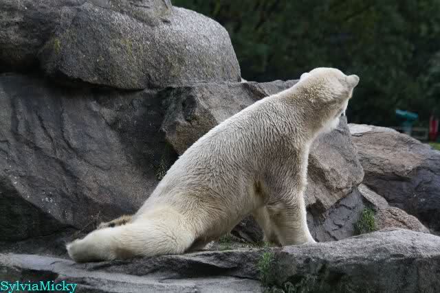 Im Laufe des Vormittags ging Kati mehrmals ziemlich schnell auf ihn zu. Sie brummte, Knut auch aber er blieb stehen. Sie trollte sich dann. Als er vorne auf dem Felsen lag kamen alle drei Bärinnen auf ihn zu. Mein Gott, war ich ängstlich. Aber Knut nicht. Er stand langsam auf und brummte die drei an. Sie gingen dann auch weg.