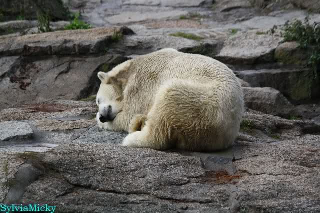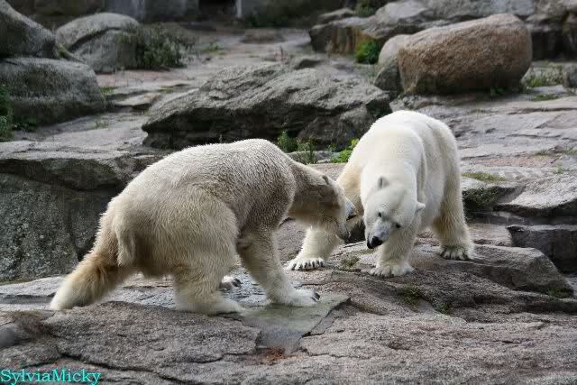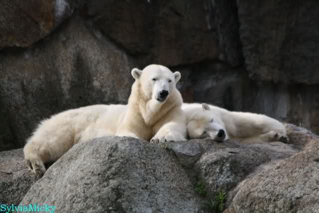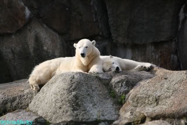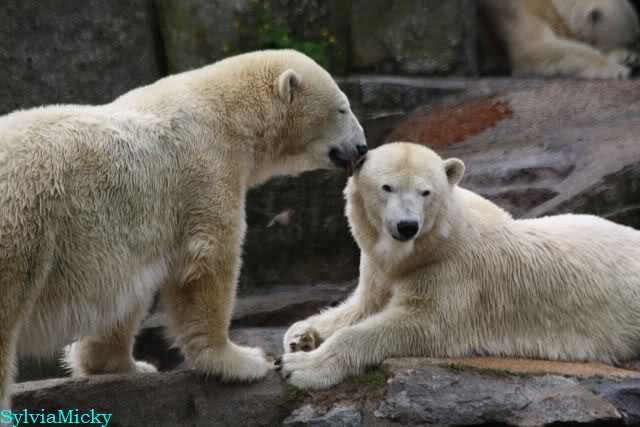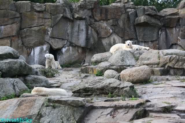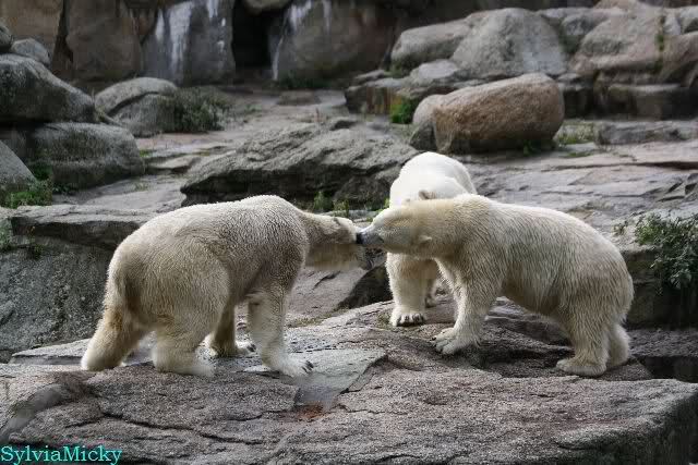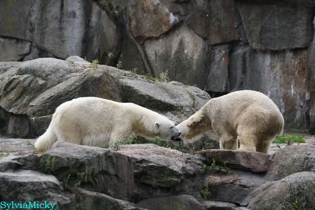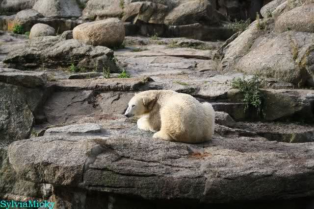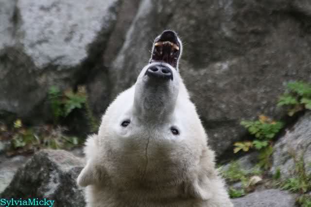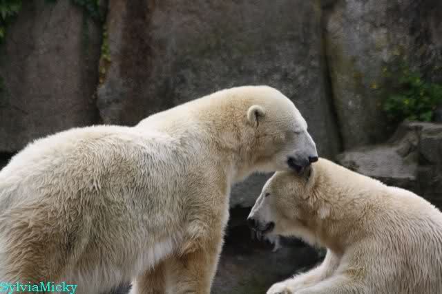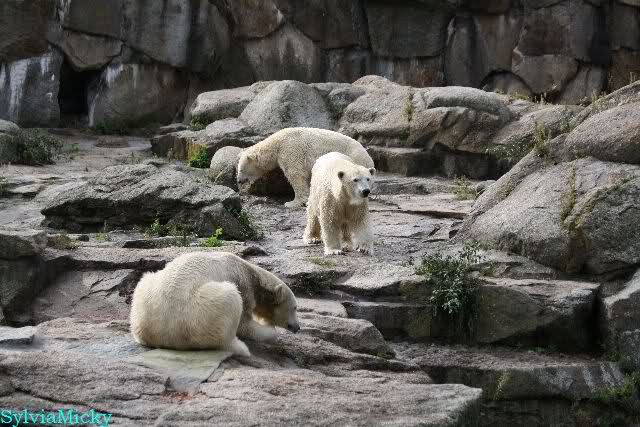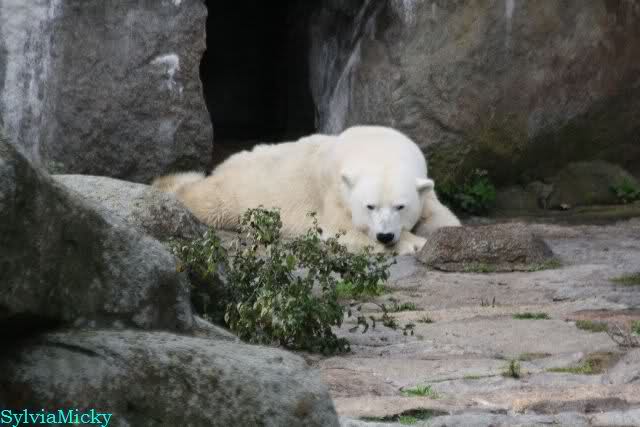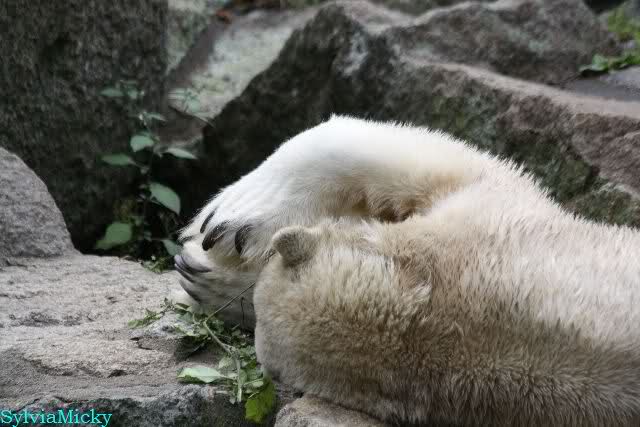 Im Laufe des Vormittags ging Kati mehrmals ziemlich schnell auf ihn zu. Sie brummte, Knut auch aber er blieb stehen. Sie trollte sich dann. Als er vorne auf dem Felsen lag kamen alle drei Bärinnen auf ihn zu. Mein Gott, war ich ängstlich. Aber Knut nicht. Er stand langsam auf und brummte die drei an. Sie gingen dann auch weg.