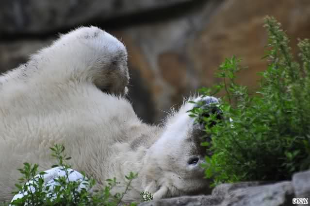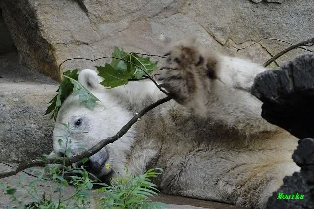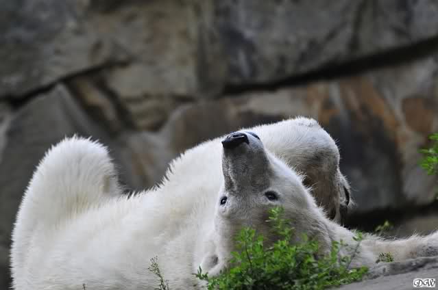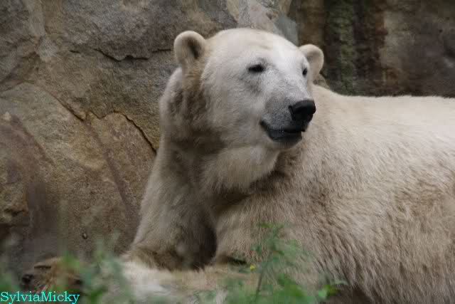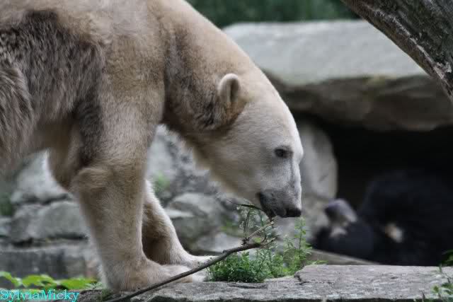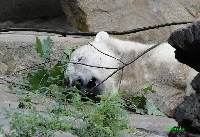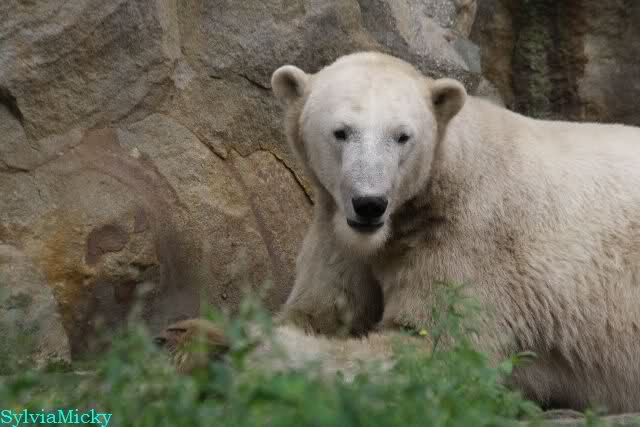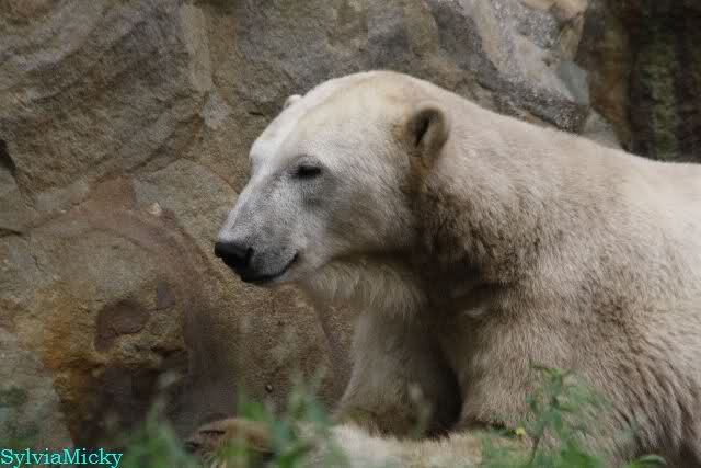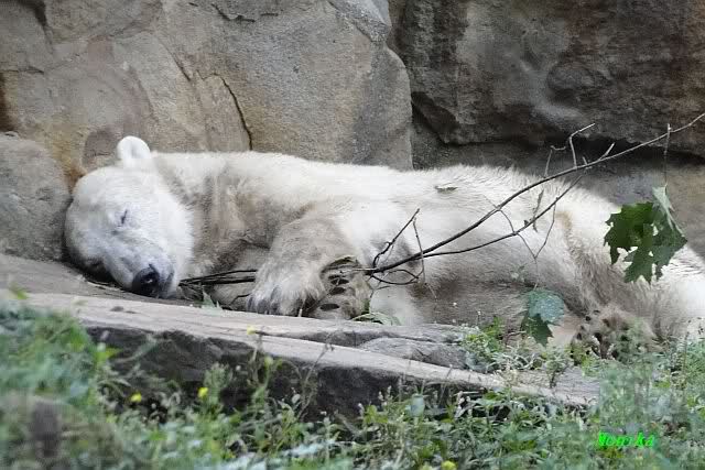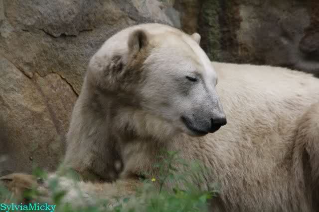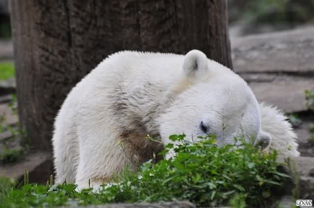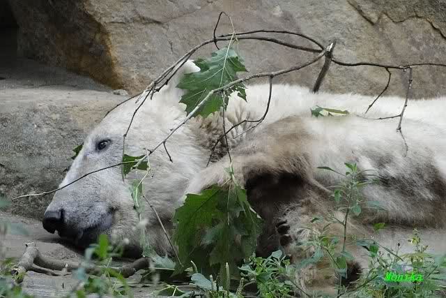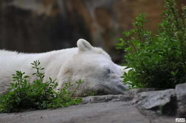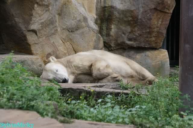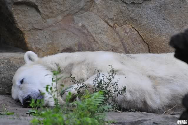 Am Vormittag döste Knut. Ab und zu hob er den Kopf und betrachtete die Zuschauer. Ganz kurz ging er über die Anlage suchte ein Pflänzchen um sich dann wieder hinzulegen und weiter zu dösen. Als ich gegen Mittag den Zoo verließ lag er noch an der gleichen Stelle.