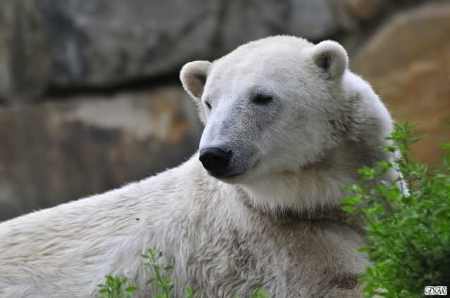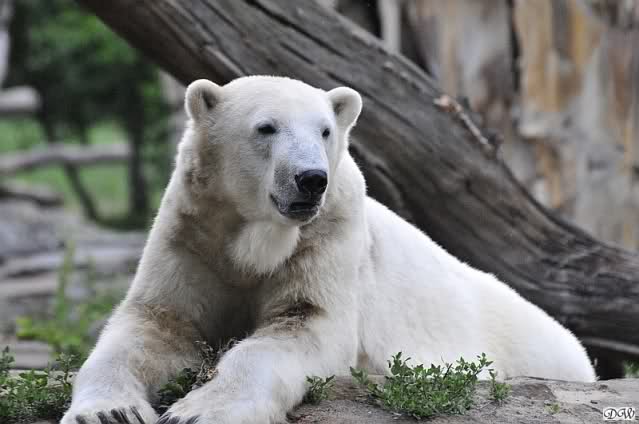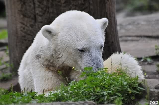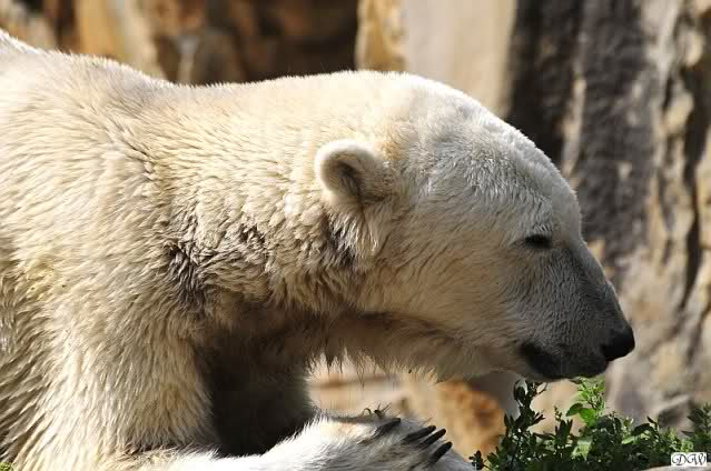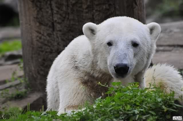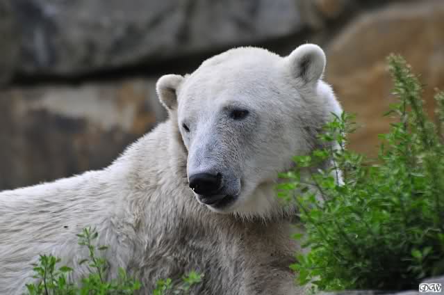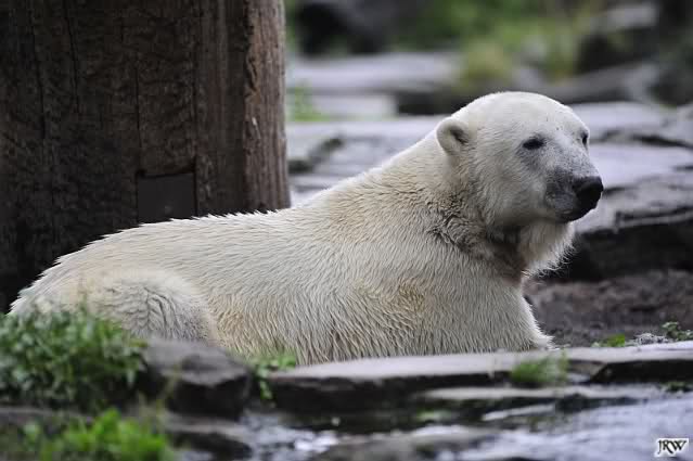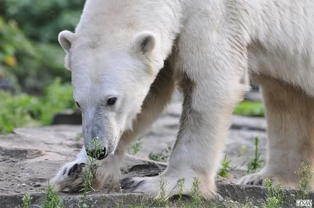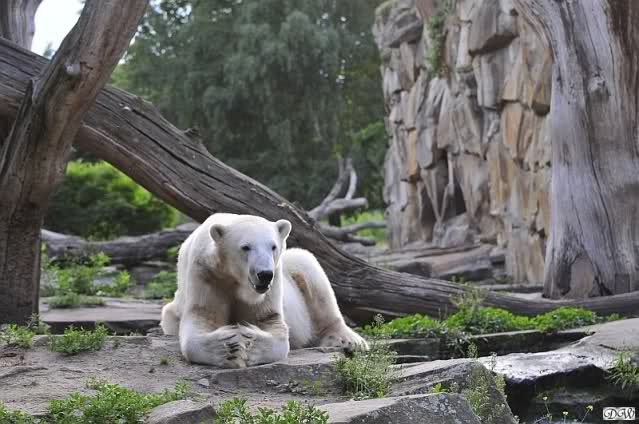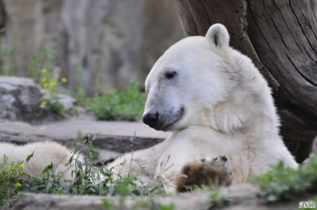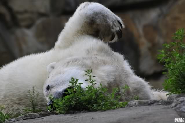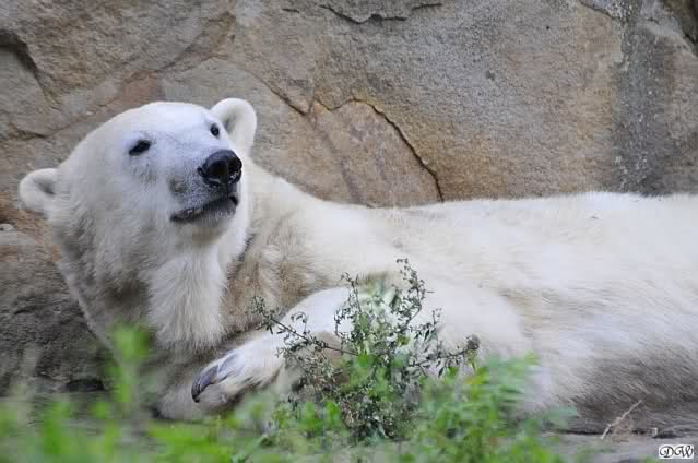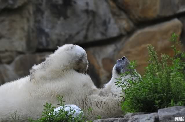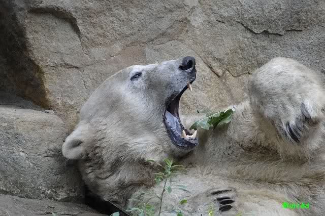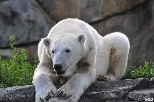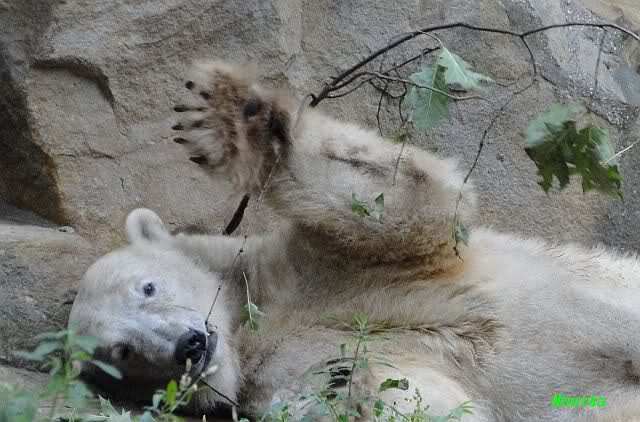 Am Vormittag döste Knut. Ab und zu hob er den Kopf und betrachtete die Zuschauer. Ganz kurz ging er über die Anlage suchte ein Pflänzchen um sich dann wieder hinzulegen und weiter zu dösen. Als ich gegen Mittag den Zoo verließ lag er noch an der gleichen Stelle.