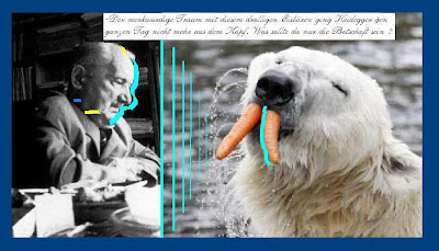 Wenn’s weiter so frostig bleibt, sollte ich vielleicht doch unserm Weißbär, äh Eisbär Knutili mal endlich einen Besuch abstatten. Bei diesen Temperaturen müßte er eigentlich aufleben und vor Lebensfreude nur so quietschen. Echtes Knut-Wetter eben, aber immerhin heute mit ausgiebig Sonnenschein. Stelle mir vor, daß der beliebteste Berliner derzeit weltweit, wie naarrisch im Schnee herumtoben wird, irgendeim komischen Gegenstand hinterherrennt, eim Eimer, eim Weihnachtsbaum oder eim alten, löchrigen Sack, denn der Schnee dürfte bei ihm starke Sehnsuchtsbilder nach der nie gekannten Urheimat auslösen, nämlich nach dem alles überdeckenden Weiß, in dem er dann fast vollständig aufgeht, weil er mit dem Weiß ringsum verschmilzt, ja Teil wird und sich damit nicht mehr nackt fühlen muß - denn in hiesigen Breiten bleibt für gewöhnlich für alle auf weite Entfernung bestens erkennbar wie ein weißer Pudel. Und jetzt, wo er seit einigen Monaten eine Gespielin namens Gianna hat, erst recht und wie man hört, vertragen sie sich und spielen recht munter in ihrem Gehege; gut möglich, daß der anhaltende Schnee bei ihm nun Frühlingsgefühle auslöst. Bei der Gelegenheit kann ich’s auch zugeben - ich bin nämlich ein echter Knut-Fän. Ist doch nicht ehrenrührig, oder ? Dieser ehemals kleine und drollige Eisbär hat (auch heute noch) mehr Talent und Charme und überdies einen viel größeren Unterhaltungswert als die meisten unserer Unterhaltungskünstler, die Pullitker mit eingeschlossen. So oft wie Knutili mich die letzten zwei (oder sind es gar drei ?) Jahre zum Schmunzeln und zum Auflachen gebracht hat mit seinen verrückten Manövern, Maskeraden oder Mohrrüben, das ist schon einen Dujardin, nein einen Asbach wert. Und eben auch eine dankbare Erwähnung, da die meisten anderen Ereignisse, die den Weg in die Öffentlichkeit finden, einen doch eher zornig, mutlos oder gleichgültig zurücklassen. Neben all der Zumutungen sonder Zahl aus Politik, Medien ist er zweifelsohne ein Lichtblick, der einen für den Moment von der traurigen Realität eines Landes ohne Identität und Selbstbehauptungswillen abzulenken vermag. Darauf also einen vom Garten. Oder einen Aspach Urwald, Wenn einem so viel Gutes widerfährt, das ist schon einen Aspach wert. Denn in Aspach Urwald ist der Schweiß des Schweines. Ach, wenn Knut sprechen könnte, würde er bestimmt lustige Sachen sagen und auch mit Worten seine Witze machen und nicht bloß seinen Fäns aus aller Welt mit erhobener Tatze über den Graben zuwinken …
