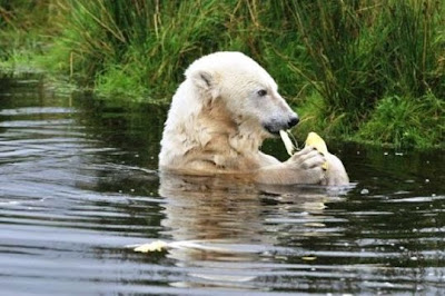 Afterwards she was rewarded with her favourite sweetcorn while taking a dip in her pool...That's what is called great service, isn't it? Not only polar bears would step onto a scale for such treats!