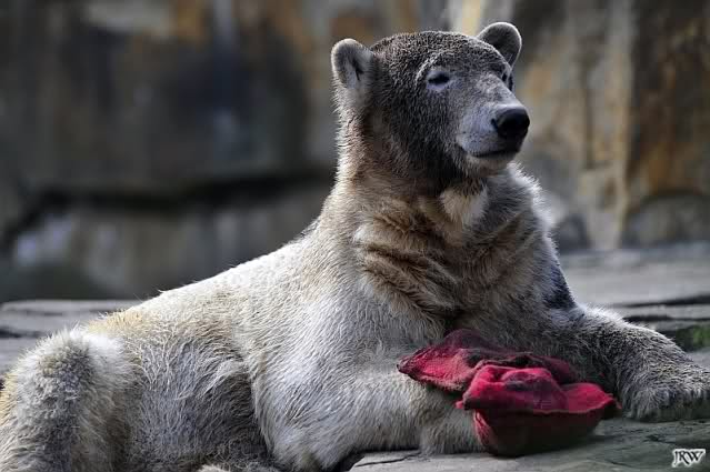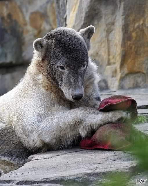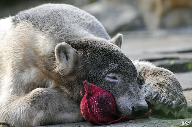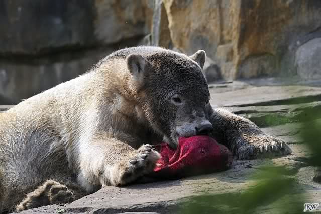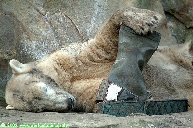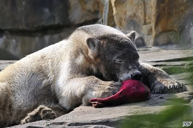 Guten Abend an alle Knut Freunde. Ein auch wieder schöner Sonnentag geht langsam seinem Ende zu. Ich war heute auch über 4 Stunden am Nachmittag im Zoo und habe einige Knut Fotos mitgebracht. Auch heute war der junge Bär wieder sehr mit seinem Spielzeug beschäftigt. Selbst in seiner Ruhephase beschäftigt er sich immer mit seinem Spielzeug. Es ist faszinierend ihn dabei zu beobachten: Wie sanft geht der Bär mit seinen großen Tatzen mit dem Spielzeug um. Viel sanfter als so manches Menschenkind.