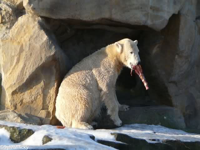 Das Futter bekam der Eisbär teilweise nach oben auf die Anlage geworfen, den anderen Teil nach unten (?). Das sich der Bär mit dem Eis schwer tat, dürfte Jedem klar sein.
