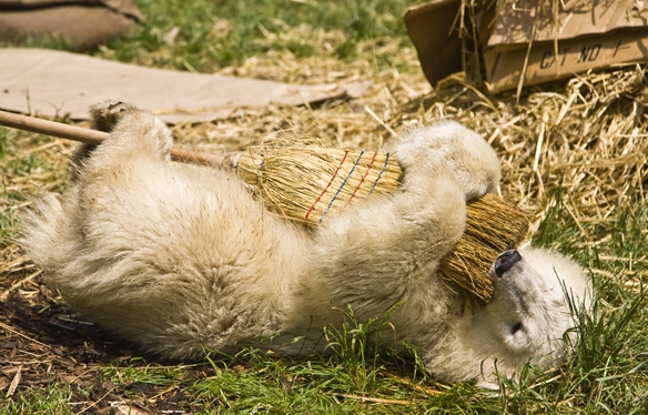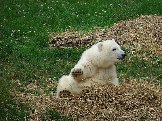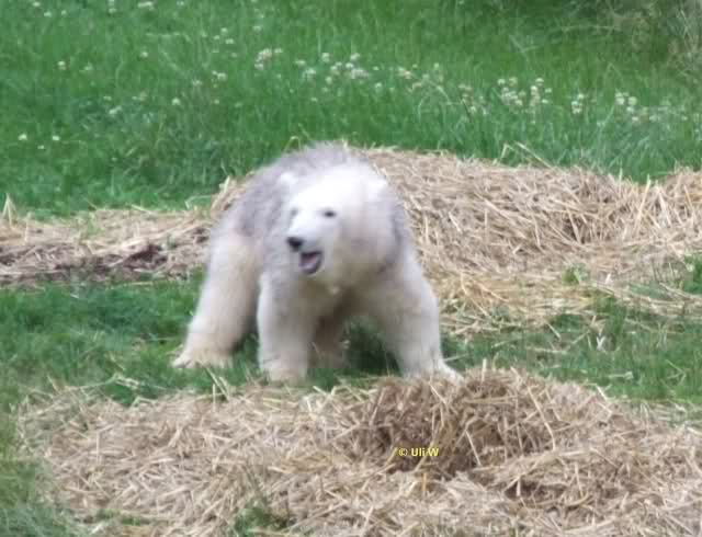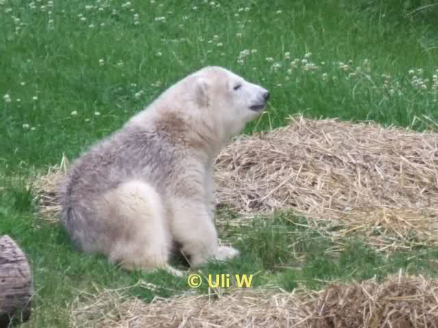 Mir scheint schon, dass sich die Kleine alleine langweilt. Sie hat gar keine Lust zum spielen, sondern liegt meistens und nölt vor sich hin, wenn sie nicht gerade zur Tür läuft um zu sehen, ob nicht doch jemand öffnet und sie reinlässt oder zu ihr ins Gehege kommt. Ich habe allerdings vorhin im Gästebuch der offiziellen Flockeseite gelesen, dass sie anscheinend immer noch mit den Zähnen zu tun hat, vermutlich kommt da alles zusammen. Ich habe heute zwar Herrn Maußner zweimal kurz gesehen, aber er war so schnell wieder weg, dass ich ihm keine Fragen stellen konnte. Auf jeden Fall hat Flocke eine gut funktionierende innere Uhr, so ca. 15 Minuten vor 11 wurde sie plötzlich munterer, ist auch mal ins Wasser, hat sich ein wenig im Heu gewälzt und für mich war klar, dass sie weiß, dass sie gleich rein darf. Und irgendwie schien mir, als wäre sie in den letzten zwei Wochen doch ein ganzes Stück gewachsen, vor allem die Pfoten Sie ist wirklich ein wunderschönes Bärchen.