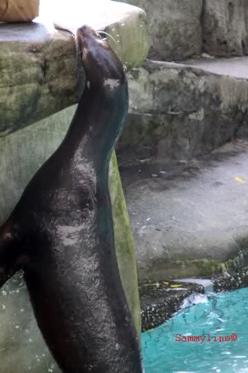 Frau Hartmann war mit einem Hochdruckschlauch zu Gange und spritzte das leere Becken ordentlich ab. Sie war mit einer riesigen weißen Gummischürze und den entsprechenden Stiefeln äußerst "elegant" gekleidet und das Ganze passierte unter den gestrengen Augen einiger Seehunde, Robben oder Seelöwen (so genau kenne ich mich da nicht aus), die Frau Hartmanns Aktionsradius mit lautem Gebrüll begleiteten.