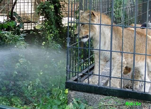 Ein Gärtner sprengte vor dem Gehege der beiden Löwenkinder. Nathan und Miron zeigten reges Interesse.
