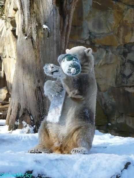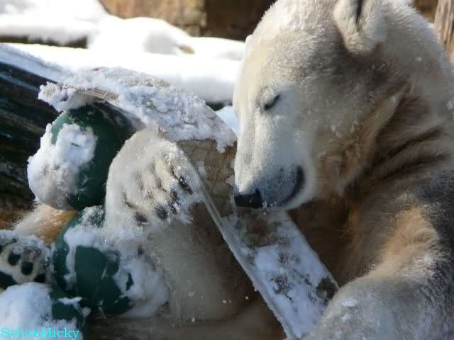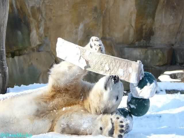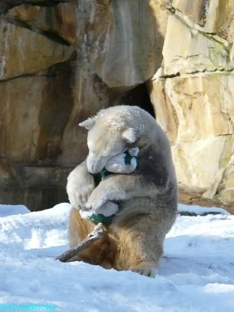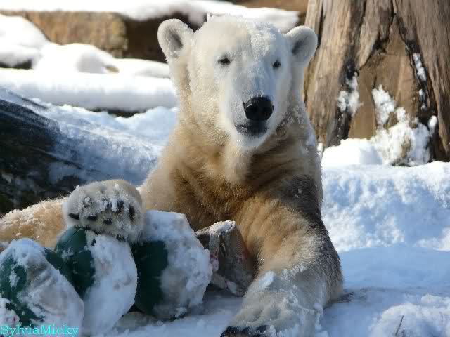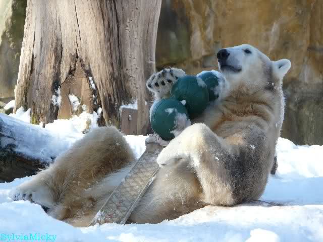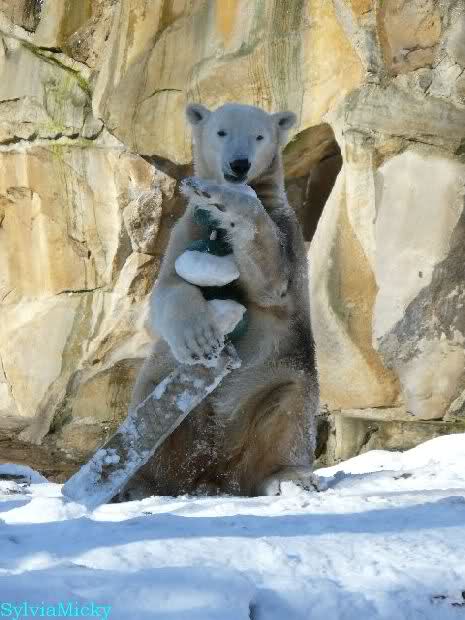 Ich habe gerade bei Marion K. viele schöne Fotos von heute Morgen gesehen. Knut und Tosca spielten auf Tosca`s Insel. Knut blieb auch während der Fütterung auf der Insel. Ist doch echt klasse.