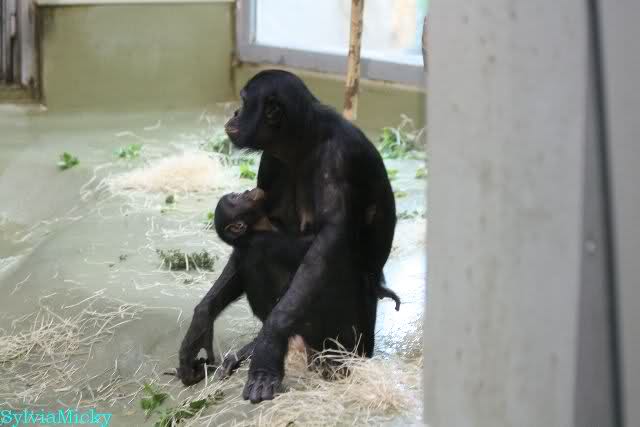 Das Bonoboweibchen hatte alle Pfoten zu tun, Kivu von dem Baby fern zu halten. Kivu ist ganz schön grob zu dem Kleinen