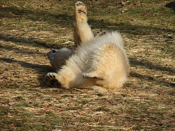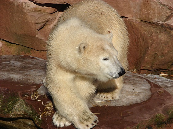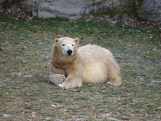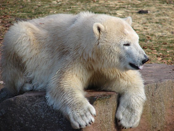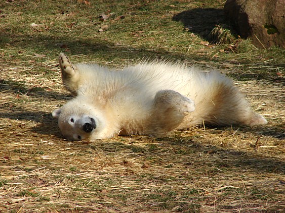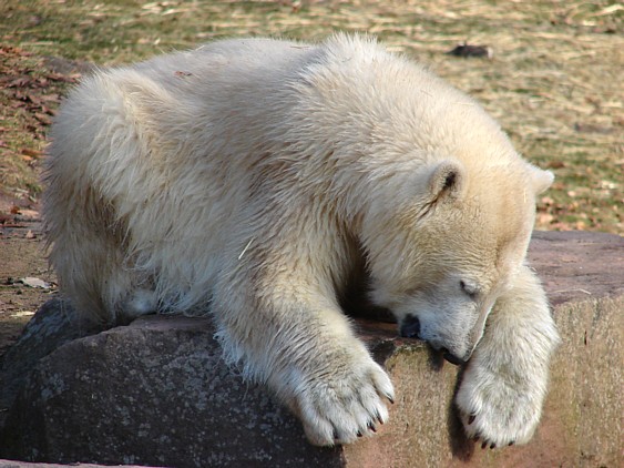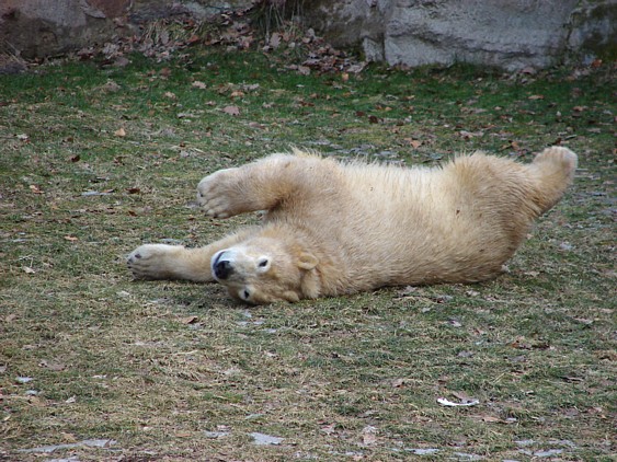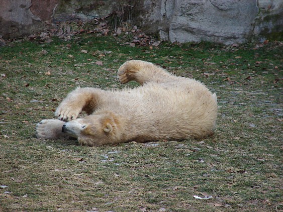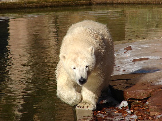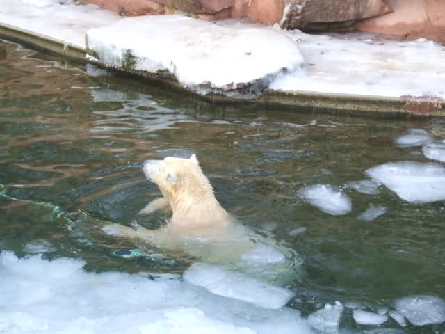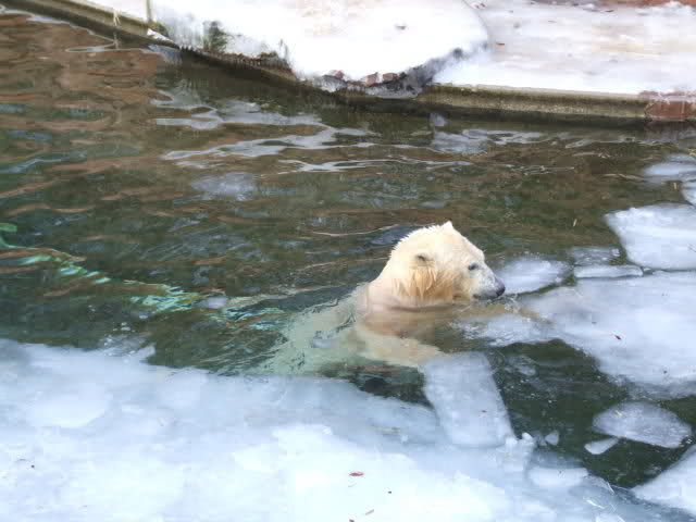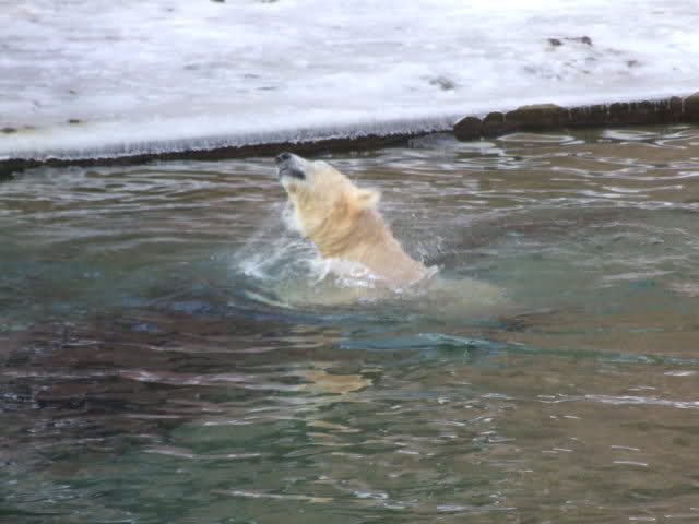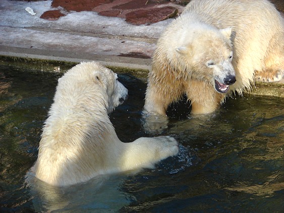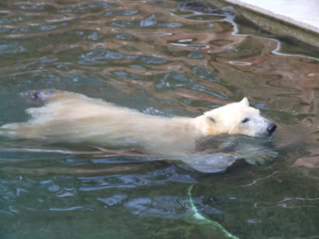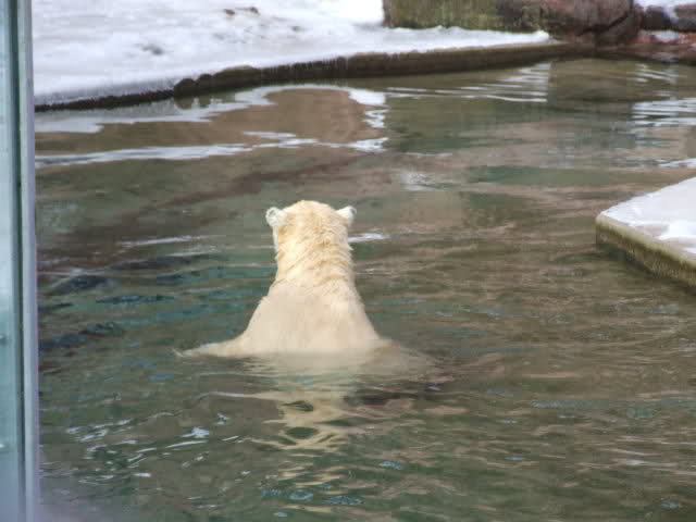Nachdem ich letzte Woche krank war, dachte ich mir, dass ein bisschen frische Luft nicht schaden kann und bin gestern in den Tiergarten gefahren. Als ich bei den Bärchen ankam, war es da recht ruhig, beide waren in dem Moment nicht zu großen Aktivitäten aufgelegt. Rasputin kam dann in die Gänge, ging ins Wasser und amüsierte sich. Allerdings ist ihm ein Malheur passiert. Er hatte sich wohl etwas überschätzt und sprang vom Mäuerchen runter ins Becken. Leider kam er nicht weit genug und hat sich glaube ich ziemlich heftig die Hinterbeine angeschlagen. Danach war er kurzzeitig verdattert, er zog leicht hinkend von dannen und auch die Lust auf's Schwimmen war ihm erstmal vergangen. Glücklicherweise hat er sich aber wohl nicht verletzt, wie ich erst befürchtet hatte. Mir scheint auch, dass er seit meinem letzten Besuch ein wenig abgenommen hat, vielleicht haben sie ihn auf Diät gesetzt, er ist ja schon ein ziemlicher Brocken.