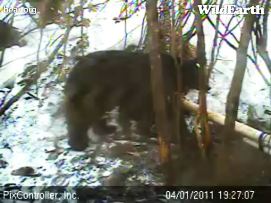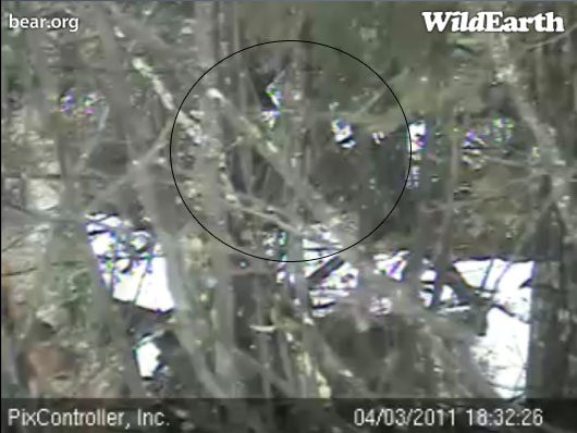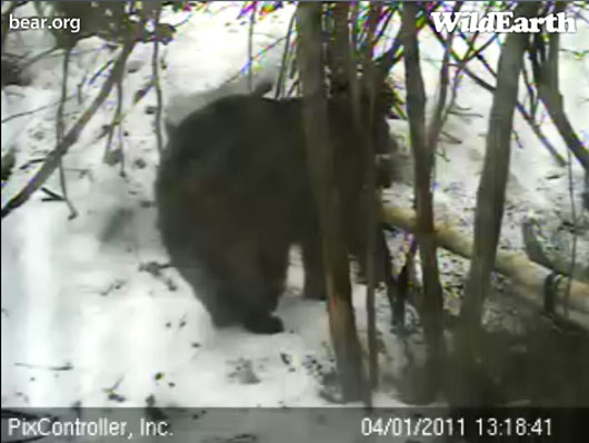 Der Boden der Höhle sieht dunkler aus, was, wie wir denken, Feuchtigkeit ist. Inzwischen bleibt die Familie an dem Ort entfernt von der Höhle. Es sieht so aus und klingt auch so als ob die Jungen ok wären. Wir wünschten wir könnten jetzt besser sehen. Das bisschen Bewegung das wir durch die Bäume sehen sieht aus wie gewohnt mit Hope wahrscheinlich mit den Pfoten mit den Kleinen spielend. Alles sieht gut aus. Wir werden sehen was sie in den nächsten paar Tagen mit kaltem Nieselwetter bevor es am Donnerstag wieder in die 40-iger gehen wird unternehmen werden. Wir nehmen an, dass Lily und vielleicht auch Hope das tun werden was June mit Bud Cal und Lily während der feuchten Woche als Lily klein war 2007 getan hat. June leckte die ganze Zeit Wassertropfen von ihnen, ganz wie es Blackheart mit Dot und Donna (beide noch am Leben) 2000 in ihrer Höhle gemacht hat und wie es in dem Film „Der Mann der mit den Bären wandert“ dokumentiert ist. Schauen Sie sich das VIDEO von June wie sie sich um ihre nassen Jungen kümmert, an.