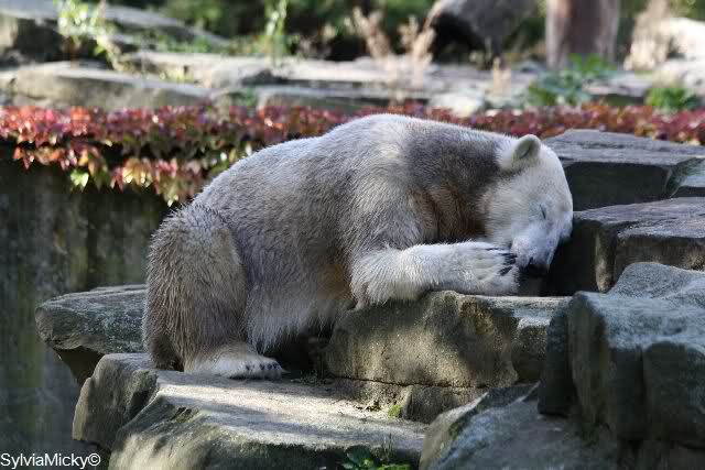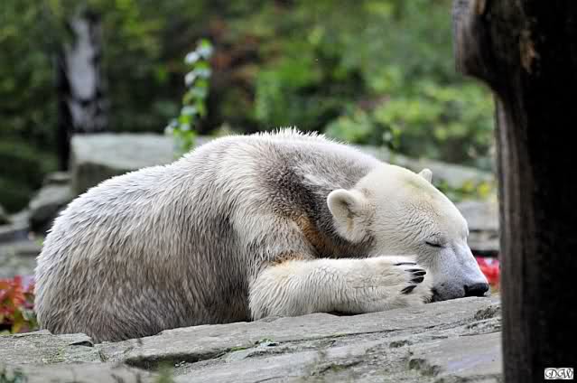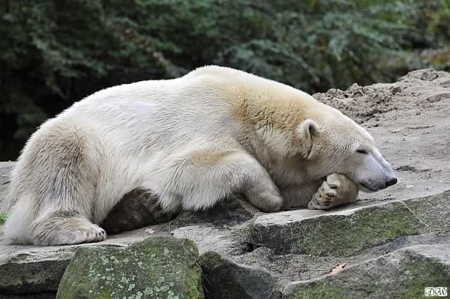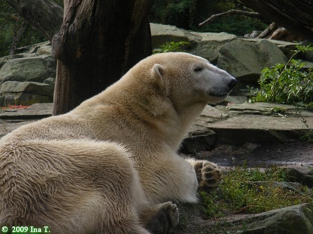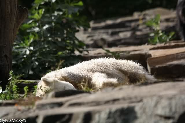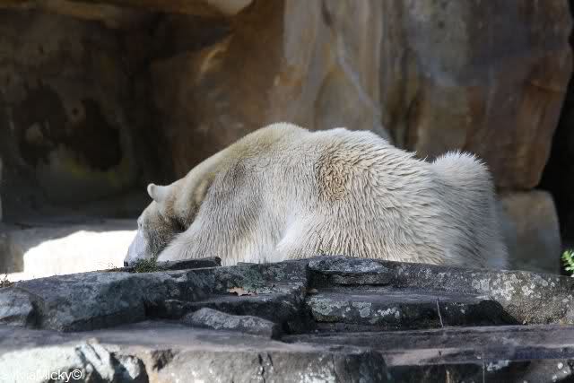 Als ich den Zoo verließ, lag Gianna unter dem mittleren Baum und schlief mit ausgestreckten Hinterpfoten. Knut schlief auf dem Felsen in der linken Ecke.