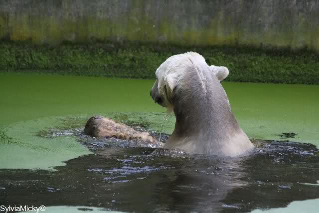 Es wurde ja schon geschrieben, dass Knut lange im Wasser mit all seinen Spielzeugen getobt hat. Gianna schaute von oben zu. Knut schnaufte und fauchte sie öfters aus dem Wasser an, so dass sie heute doch sehr verunsichert war, und wie verloren über die Anlage lief und in die Höhle wollte, die jedoch geschlossen war. Dann der Höhepunkt von heute. Knut war im Wasser und Gianna ging hinterher. Knut schwamm um die Ecke und stieg nach oben. Wenige Minuten später war Gianna im Wasser und Knut ging zu ihr ins Wasser. Wir staunten nicht schlecht. Als Gianna auf ihn zuschwamm flüchtete er doch wieder nach draussen. Im Allgemeinen hatte man heute das Gefühl, dass der Abstand von den Beiden immer geringer wird. Es war jedenfalls wunderschön, Knut heute so ausgelassen zu sehen.
