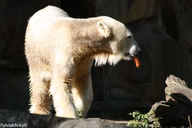 Heute fütterte Frau Weckert. Gut wie immer. Von der netten Knutfreundin aus München gab es eine Forelle. Einige Minuten später wurde Gianna rausgelassen. Sie klaute ihm einige Rüben. Manche fraß sie, manche ließ sie wieder fallen. Knut rettete aber einige für sich. Sie kommen sich sehr langsam näher.