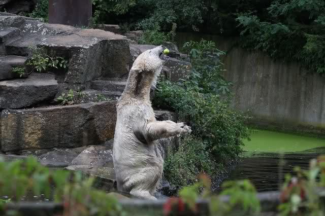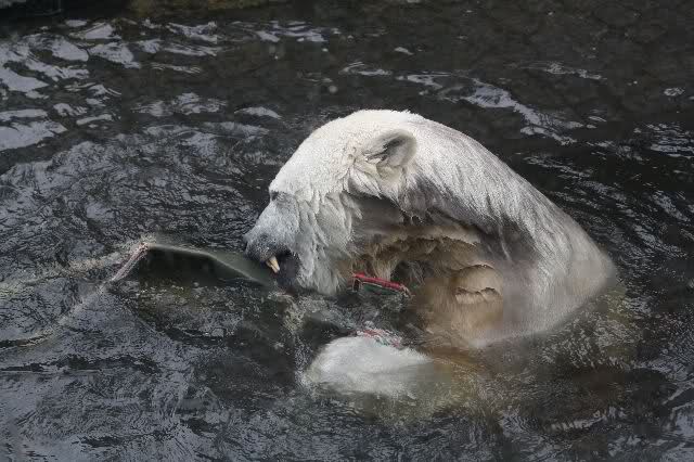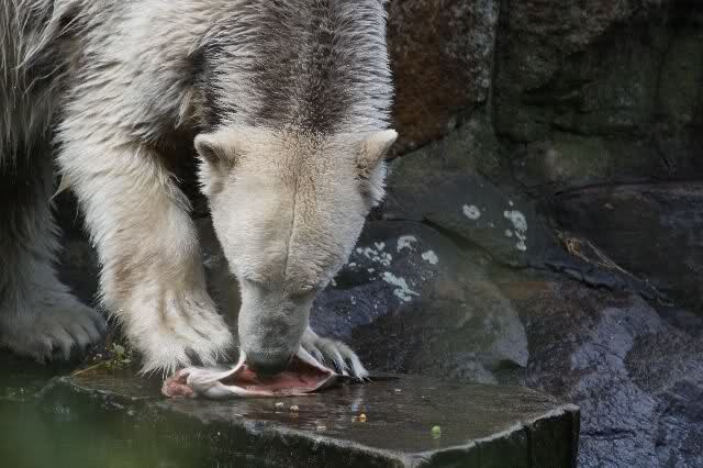 Heute früh von neun bis viertel nach elf tobte Knut im Wasser mit dem Baumstamm und Nackthuhn. Danach wurde etwas geruht. Gefüttert wurde er von Frau Weckert. Sie nahm sich wie immer Zeit. Es gab auch einen großen Lachs. Auch heute waren wieder viele Knutfreunde im Zoo.