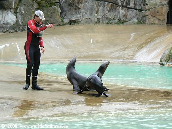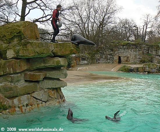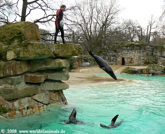 Es macht Spaß mit anzusehen, wieviel Freude die Tiere in diesen ca. 15 Minuten haben. Sie sind außer Rand und Band und führen kleine einfache Kunststücke vor. Der Pfleger begibt sich ebenfalls ins Wasser, erklärt zunächst einiges Wissenswerte über die Tierart und dann beginnt ein kleines Programm. Es ist ein Highlight im Zoo.