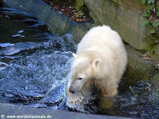 Für ihn ging es dann ganz schnell ab ins Wasser. Und das kleine Eisbären auch nicht gleich immer ins kalte Wasser springen, sondern sich vorher auch erstmal etwas nass machen um sich ans Wasser zu gewöhnen, konnte man heute beobachten.