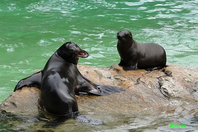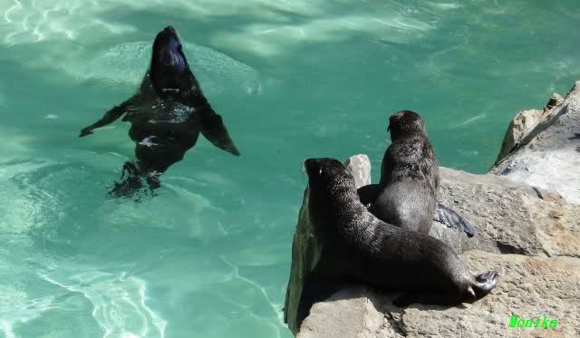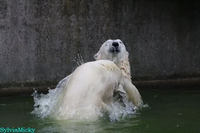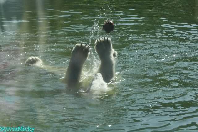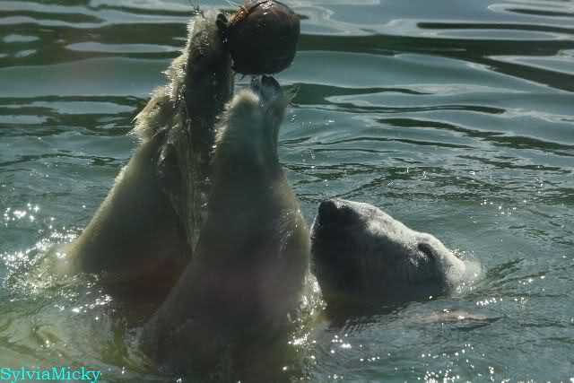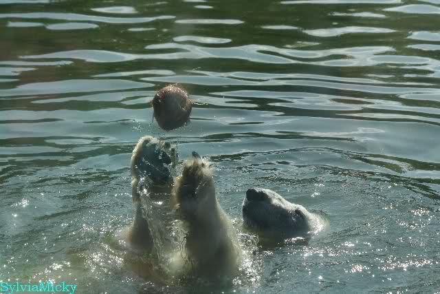 Dann bekamen sie Kokosnüsse. Sie spielten damit wie mit Bällen. Sie waren sie ins Wasser, sprangen hinter her oder warfen sie in die Luft, um sie wieder aufzufangen. Es war herrlich mit anzusehen. Dadurch standen auch viele Besucher an der Anlage. Menschen finden es viel besser, spielende Tiere zu sehen, als dröge auf der Anlage liegende.