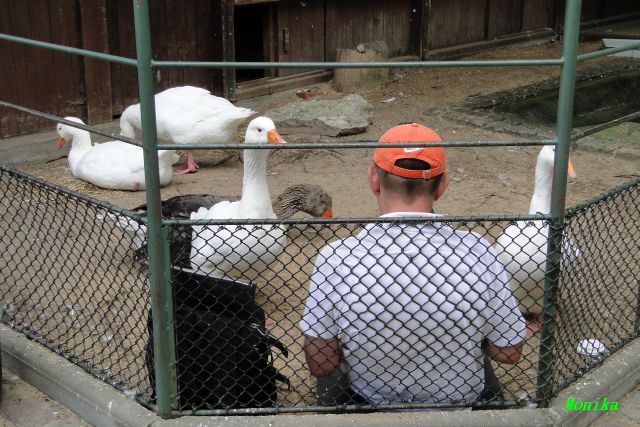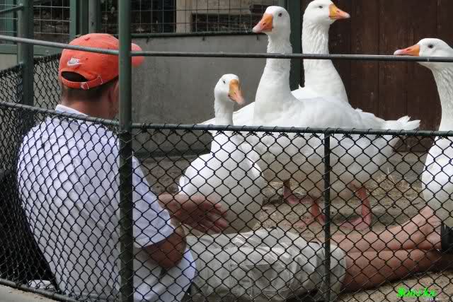 Nicht nur Knut hat seine Fans. Bei den Gänsen gibt es einen Stammbesucher, der des Öfteren stundenlang mit den Gänsen zusammen sitzt. Sie schnattern schon aufgeregt, wenn sie ihn von Weitem sehen. Da vor dem Kinderzoo zurzeit eine Baustelle ist, sind die Tiere alle hinter Gittern. So setzte sich der Gänsefan einfach mit ins Gehege.