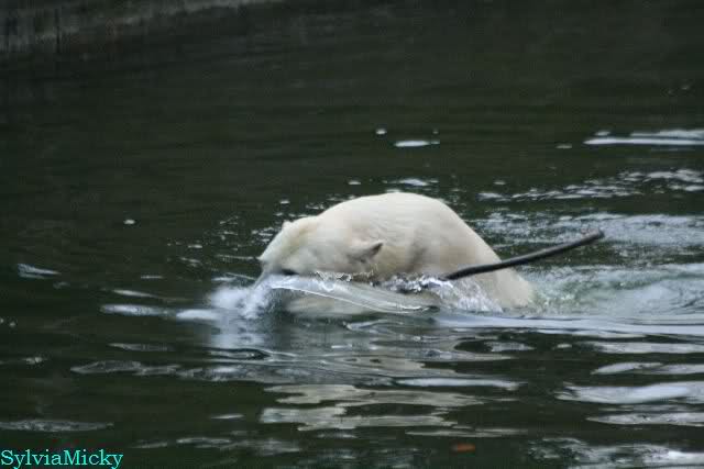Als die Baumarbeiten im Tiergarten anfingen, lief Tosca wieder auf der linken Insel hin und her. Als Ruhe war, ging sie ins Wasser. Sie fand eine Kordel, die sie Knut brachte.