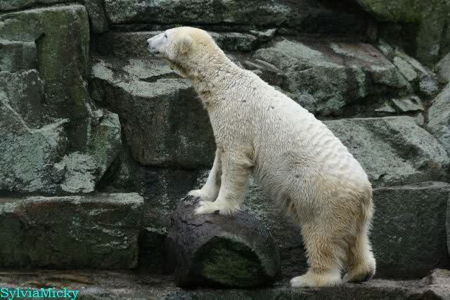 Kurz nach zehn traf ich am Eisbärengehege ein. Bei den Eisbären war Ruhe angesagt. Knut döste in seiner üblichen Ecke. Nancy saß auf der Ecke von Knuts „Balkon“ und ließ ihn nicht aus den Augen. Ganz so, als ob sie sein persönlicher Bodyguard sei.