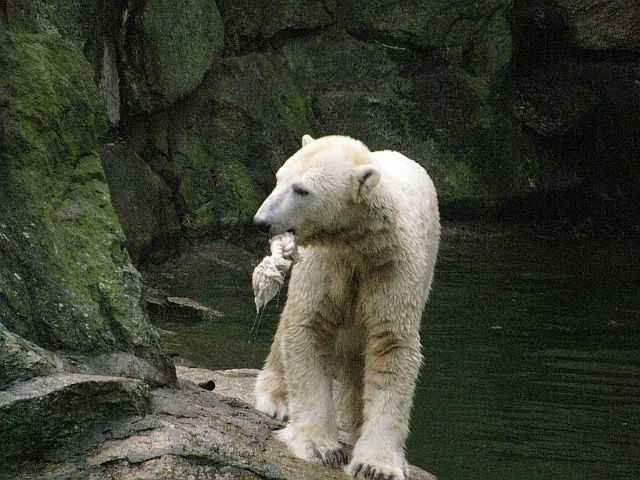 Aber Knut kletterte den Felsen hinauf und wanderte vorn zum Ufer. Sofort wanderten alle Besucher mit, natürlich vor der Anlage.