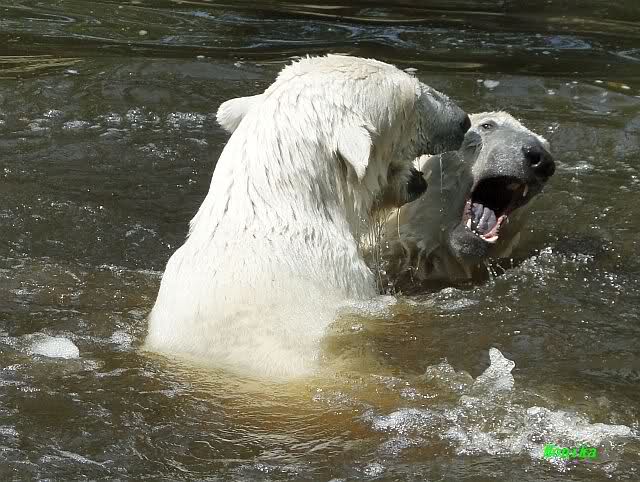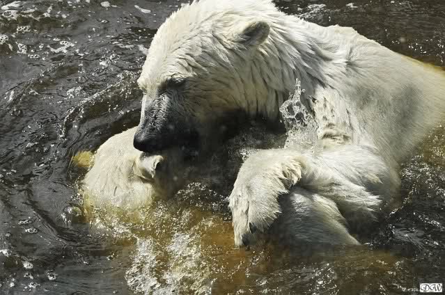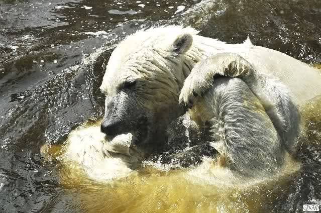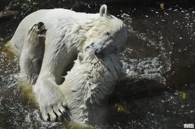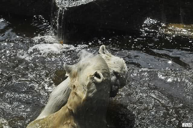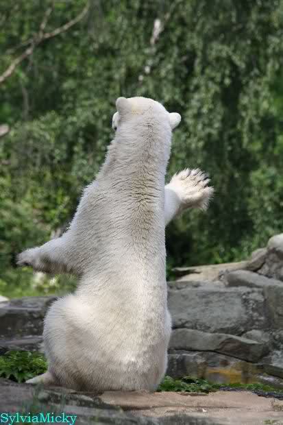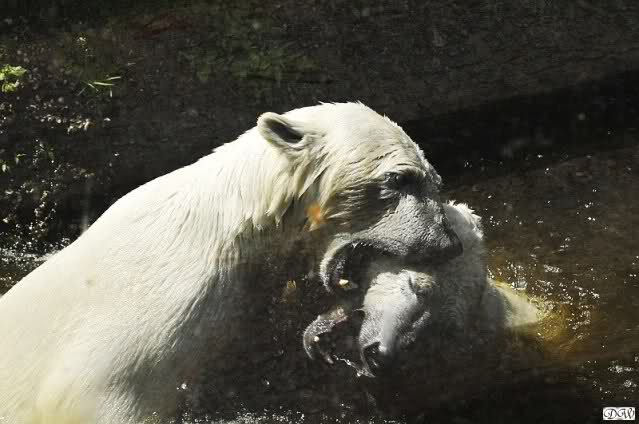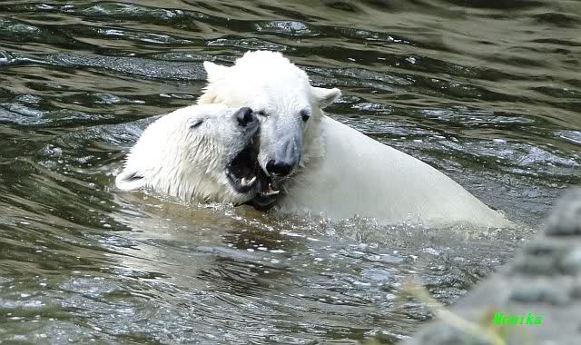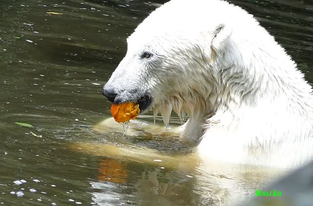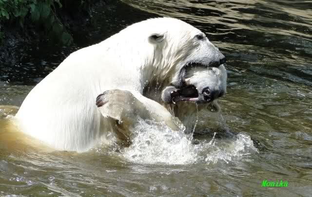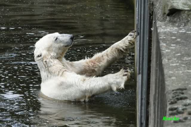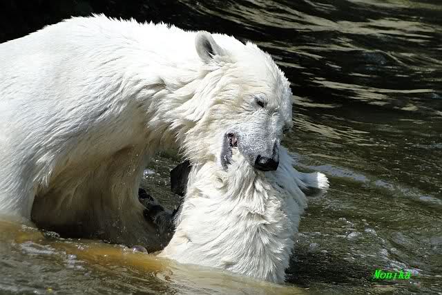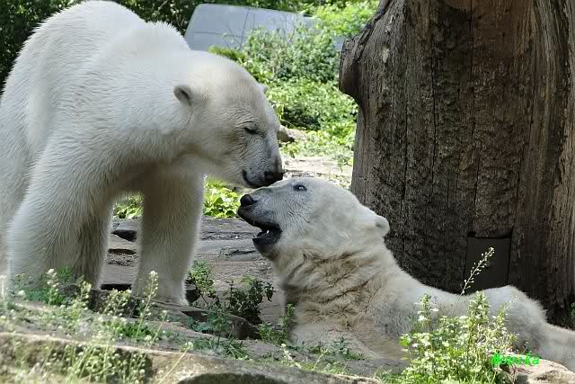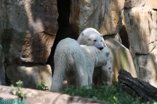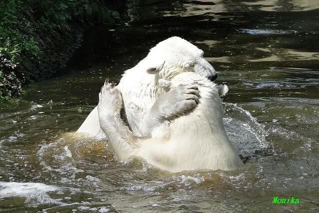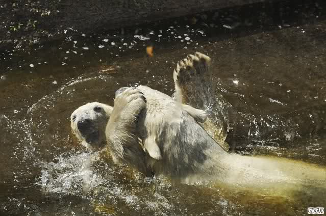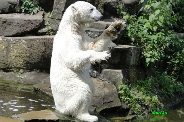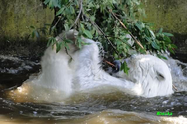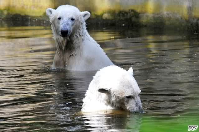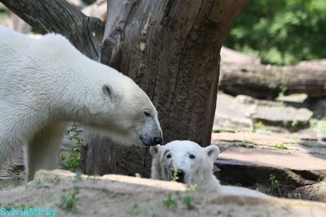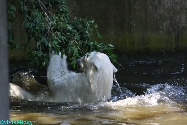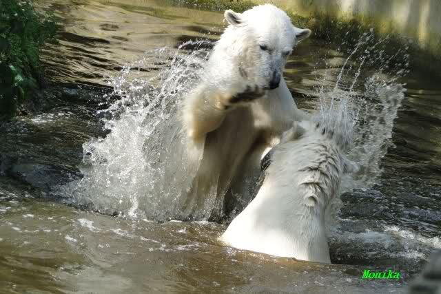 Monika, tolles Bild von Bumi in Knut's Arm. Natürlich habt Ihr Unrecht mit den weißen Bären. Dass sie sich wie wild waschen, könnt Ihr an der dunklen Farbe des Wassers erkennen